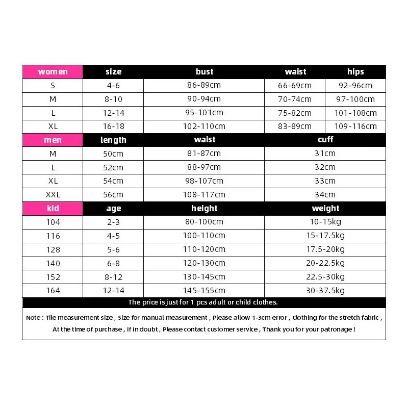 Для женщинРазмерБюстТалияБедраS4-686-89 см66-69 см92-96 смМ8-1090-94 см70-74 см97-100 смL12-1495-101 см75-82 см101-108 смXL16-18102-110 см83-89 см109-116 смМужскиеДлинаТалияМанжетаМ50 см81-87 см31 смL52 см88-97 см32 смXL54 см98-107 см33 смXXL56 см108-117 см34 смРебенокВозрастВысотаВес1042-380-100 см10-15 кг1164-5100-110 см15-17,5 КГ1285-6110-120 см17,5-для детей до 20 кг по самой низкой цене1406-8120-130 см20-22,5 кг1528-12130-145 см22,5-30 кг16412-14145-155 см30-37,5 кгЦена указана только за 1 предмет одежды для взрослых или детей.Примечание: размер для измерения плитки, размер для ручного измерения, пожалуйста, учитывайте погрешность в 1-3 см, одежда для стрейчевой ткани, во время покупки, если есть сомнения, пожалуйста, свяжитесь со службой поддержки клиентов, спасибо за ваше покровительство!