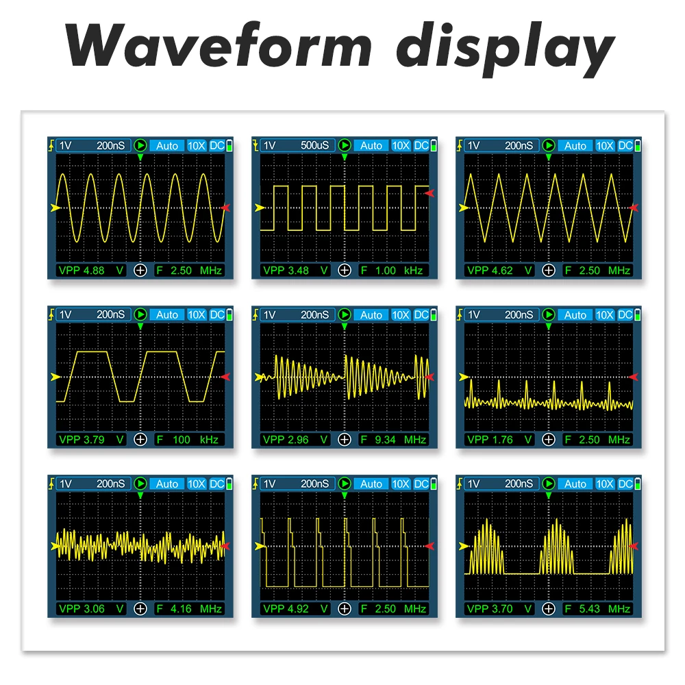 Этот профессиональный осциллограф KKmoon имеет ЖК-экран 320*240, так что вы можете видеть данные более четко, подсветка id регулируется, вы можете изменить его в разных случаях, он также имеет 4 скорости квадратной функции выходного сигнала wa-ve, и в небольшом размере, Так что вы можете взять его в любом месте, где вы хотите его использовать. Приходите и попробуйте.Особенности:С ЖК-экраном 320*240, так что вы можете видеть данные более четко.С пропускной способностью 120 МГц ana-log и 500 мс/с частотой дискретизации.С функцией 4 скоростей сигнала square wa-ve выход: 1 кГц, 10 кГц, 100 кГц, 1 МГц.12 видов измерения параметров: Vpp, Vrms, Vavg, Vp, Vmax, Vmin,F,T,T +,T-. Du +, Du-.Функции: один осциллограф ke-y, три режима сканирования: автоматический, нормальный и одиночный, 12 видов тестовых данных, может хранить 2500 сигналов, поддерживать просмотр эскизов.Параметры формы сигнала, такие как основание времени, амплитуда и наклон триггера, могут быть установлены сами по себе.Силиконовый защитный чехол с обеих сторон фюзеляжа, противоскользящий, противоосенний и ударопрочный, удобный на ощупь.Небольшой размер и светильник, так что вы можете взять его в любом месте вы хотите использовать его.Характеристики:Материал: АБС-пластикЭкран: 320*240 ЖК-экранСопротивление:* 1: 1MΩ* 10: 10 МОмХранение: 2500 сигналов DSOСостояние использования: 0C ~ + 40 ℃, < 75% RHСостояние Storoge: -10C ~ + 60 ℃, < 90% RHВертикальное разрешение: 8 битВертикальная Точность: ±(5% + 0.2div)Точность напряжения: 10%Точность частоты: 1%Уровень срабатывания: ± 3.8div (0. 1div на шаг)Положение триггера: ± 6div (0. 1div на шаг)Диапазон временной базы: 6ns/div ~ 50s/divРежим сканирования: автоматический, одиночный, нормальныйБатарея: 1*18650 литиевая батарея (в комплекте)Длина записи: 12divРазмер посылка: 190*140*45 мм/7,5*5,5*1,8 дюймовВес посылка: 390 г/13,8 унцийУпаковочный лист:1 * осциллограф1 * зонд1 * Руководство пользователя1 * USB кабель