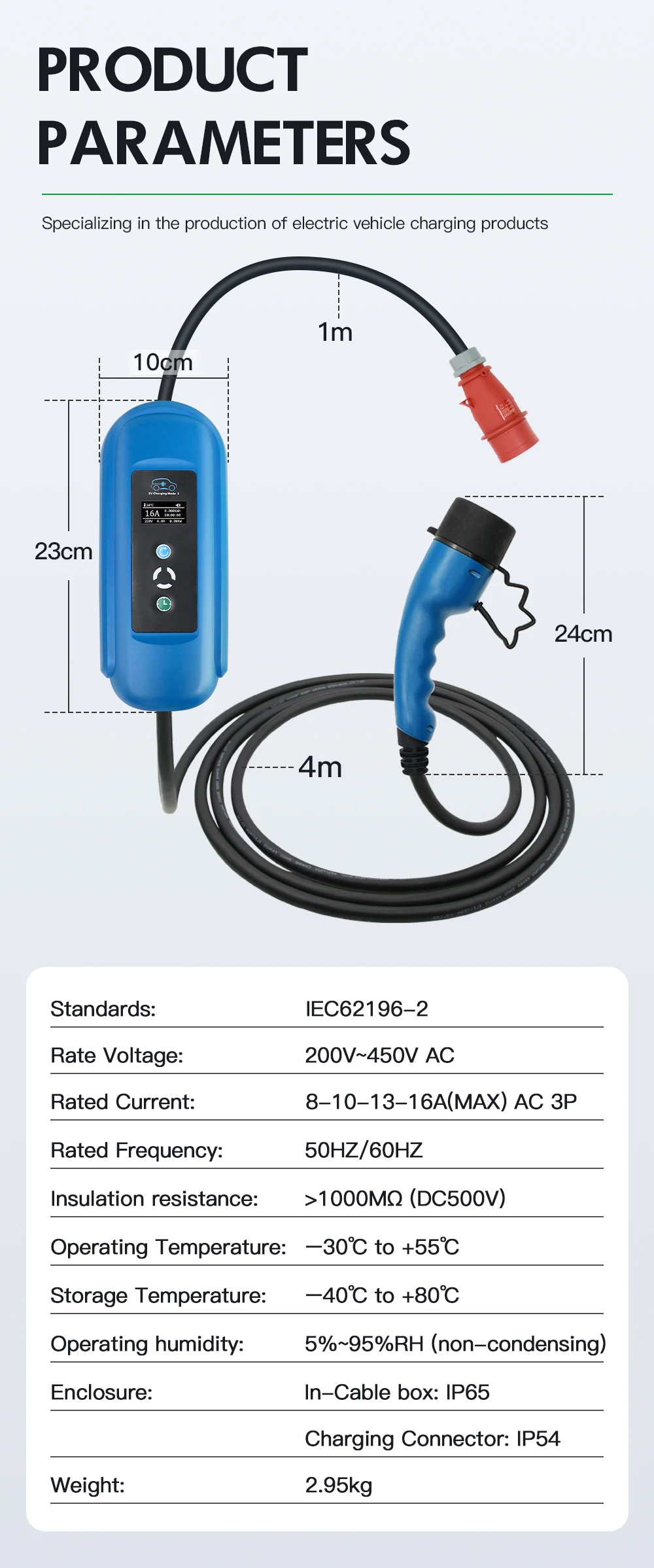 Ток: 8А/10А/13А/16АНапряжение тока: 380V ~ 450VНоминальная мощность: 11 кВт* Зарядное устройство является обычным зарядным устройством уровня 2, только для зарядки EV, оно может использоваться во всех автомобилях EV.* EVSE обеспечивает молниепроницаемость, loeakage, перенапряжение, перегрев, -- класс водонепроницаемости IP55, UL94V-0 Огнестойкость и защиту от перегрузки по току для вашей безопасности. Также он оснащен блоком управления с-светодиодный индикатор состояния заряда поможет вам определить рабочее состояние зарядного устройства EV.
