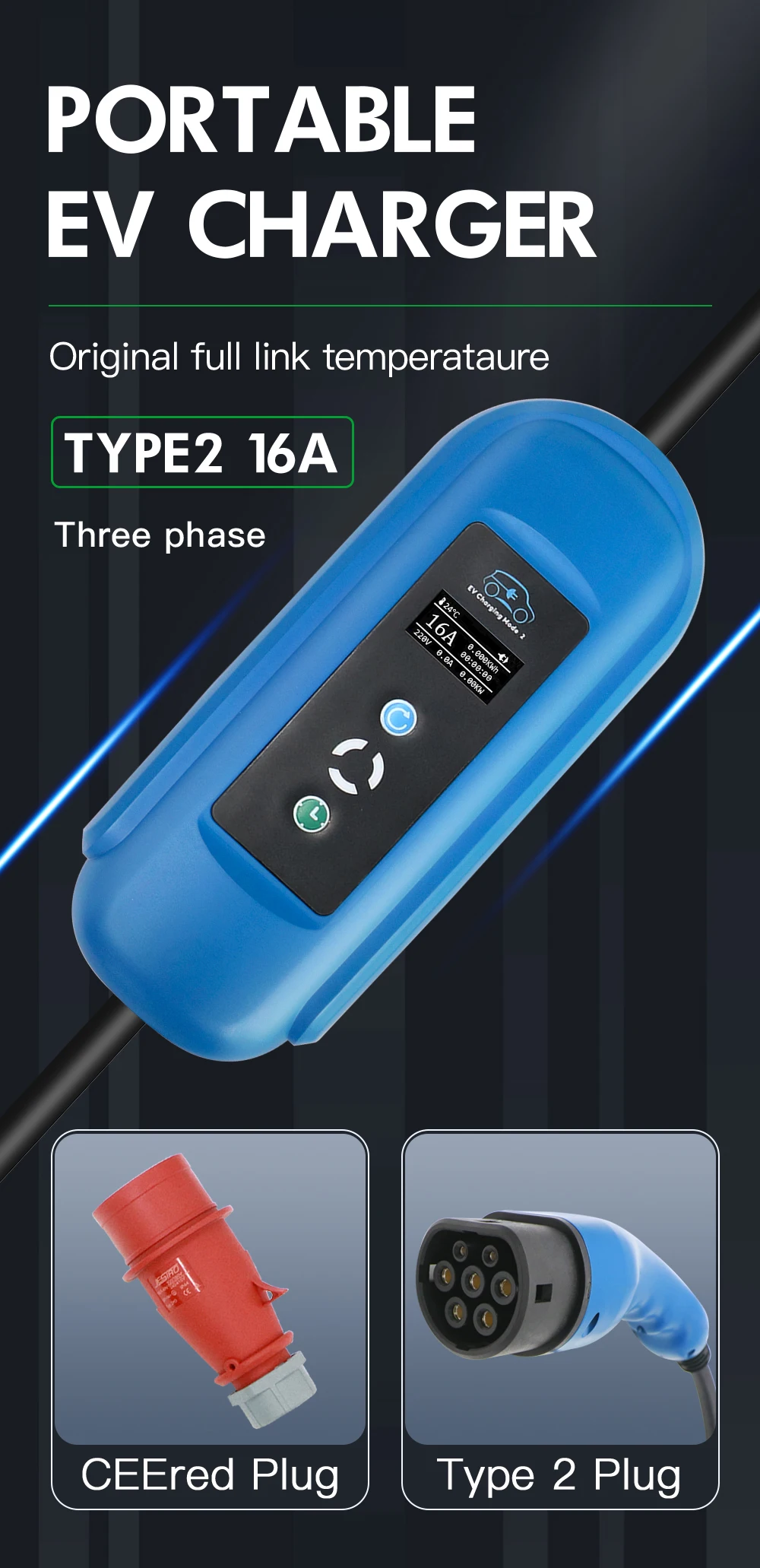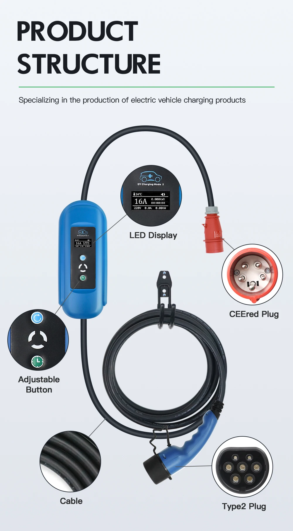 Синяя кнопка: Регулировка тока. Нажмите синюю кнопку, чтобы изменить ток. Когда вы регулируете ток, штепсельная Вилка питания всегда подключена, штепсельная вилка типа 2 IEC 62196-2 (или type 1) отключена. Когда вы достигнете нужного тока, подключите его и начните зарядку.Зеленая кнопка: Установите время зарядки. Поддерживает зарядку через 1-10 часов. Например, сейчас 8 pm, вы хотите начать зарядку в 2 pm, вы можете установить время зарядки в течение 6 часов. Электрическая производительность