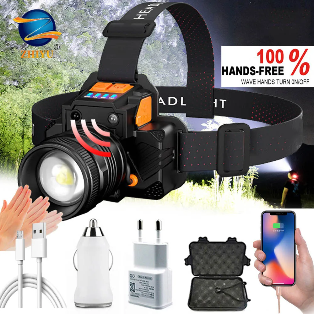 Налобный фонарь T6, светодиодный с перезаряжаемым датчиком масштабирования, 8000 Люмен, для рыбалки, охоты, кемпинга, со встроенным аккумулятором 18650