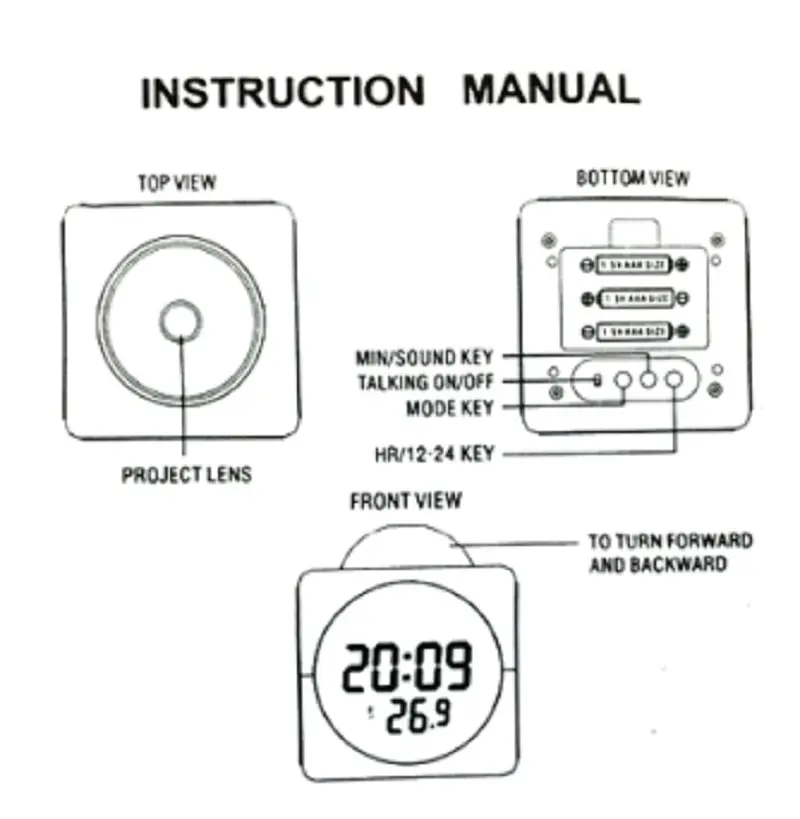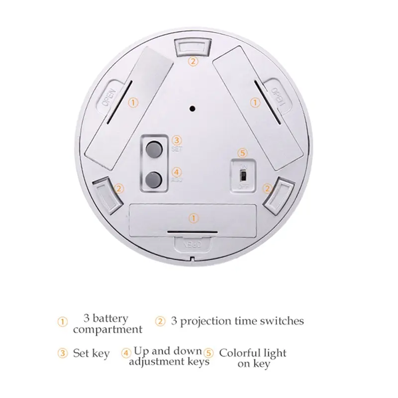 Размер: 90*90 ммЦвет: белый/черныйМатериал: АБС-пластикИнструкция по продукции:1. Установка батареи извлеките крышку батарейного отсека и вставьте 3 "AAA" размера батареи в отсек батареи2. При любом режиме нажмите верхнюю кнопку, чтобы сообщить время с подсветкой и проекцией около 10 секунд3. При нормальном режиме нажмите клавишу mode, чтобы войти в следующие режимы соответственно: Normal→ настройка времени → Настройка будильника → ALM. CHM Переключатель ВКЛ/ВЫКЛВ режиме настройки времени нажмите клавишу MIN/SOUND для настройки минут. Нажмите кнопку HR для регулировки часов4. Время срабатывания при нормальном дисплее дважды нажмите клавишу MODE, чтобы войти в режим настройки будильника, затем нажмите клавишу MIN/SOUND для настройки минут. Нажмите HR для регулировки часов5. Переключатель ALM и CHM on/off в обычном режиме, нажмите клавишу mode три раза, чтобы войти в режим настройки ALM и CHM, затем нажмите клавишу MIN/SOUND для включения/выключения функции сигнализации.Если функция будильника открыта, значок (ВКЛ) будет отображать клавишу HR для включения/выключения функции CHIME.Следующие режимы настройки будут отображаться соответственно: CHM10N → CHM20N → CHM0FEWhen CHM1 функция включена, значок 2 будет отображаться.Когда функция CHM2 открыта, значок E display6.При нормальном дисплее нажмите клавишу MIN/SOUND, чтобы выбрать сигнал тревоги.Нажмите кнопку HR/12-24 для переключения режима времени 12 часов/24 часов нажмите клавишу 2 секунды для переключения C/'F