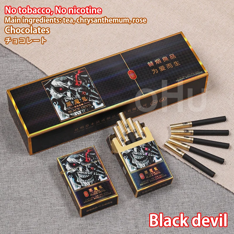 1 шт.: 20 чайных сигарет 1 коробка: 10 шт. Ингредиенты черного devil1: чай, хризантема, роза, мед, пищевая эссенция Черный devil2 ингредиенты: чай, хризантема, Роза