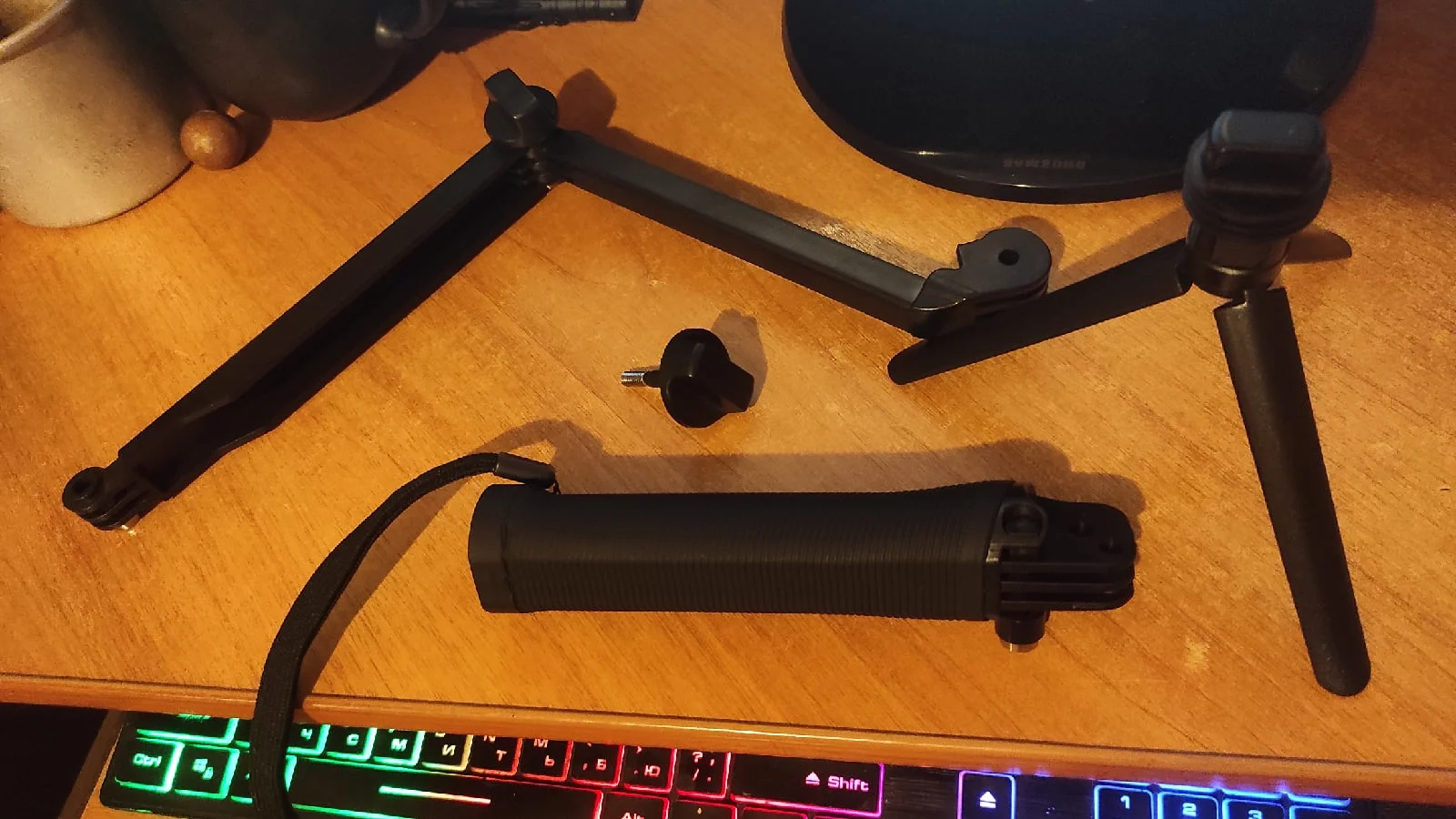 качественно, крепежи все прочные, как штатив можно использовать ,без раскладных колен, либо с одним, если ставить оба колена, конструкция получается не устойчива, но оно и не нужно, если только как селфи палка, а так отличный товар)