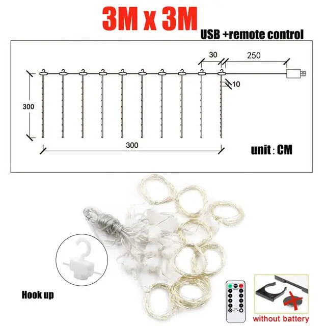 Наименование товара: Светодиодный светильник для занавесок из серебристой медной проволокиМатериал: пластик + серебряная медная проволокаРазмер: 3*3 м с 300 светодиодами3*2 м с 200 светодиодами3*1 м со 100 светодиодамиВодонепроницаемость: IP65Питание от: USBНапряжение: 5 В постоянного токаСветильник источник света: светодиодныйСветодиодный Количество: 100 /200/ 300 светодиодный sСветодиодный цвет: теплый белый/многоцветный/синийСрок службы: 50000 часовПереключатель 8 режимов: на USB или пульте дистанционного управленияС пультом дистанционного управления: Да