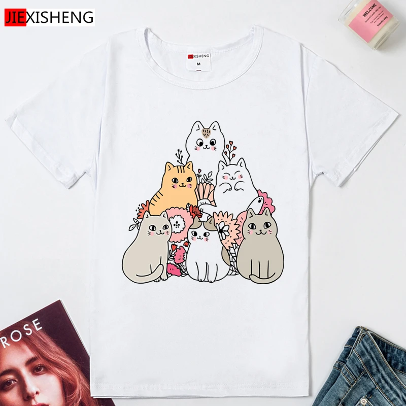 6 Кошки Футболка с забавным мультипликационным принтом графической печати для женщин женская футболка с коротким рукавом и О-образным вырезом футболка 5 видов цветов Harajuku футболка