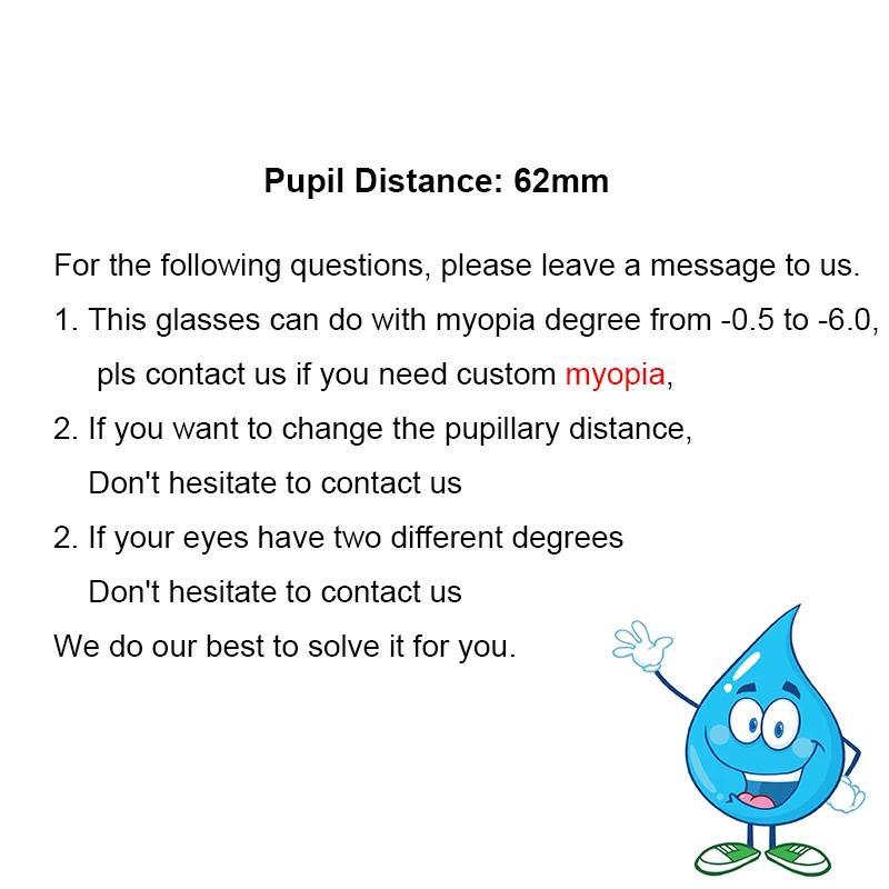 Пожалуйста, свяжитесь с нами, если вам нужноБлизорукостьОчки (сообщение для продавца: Например: R-2.5 L:-2 PD:64 мм)