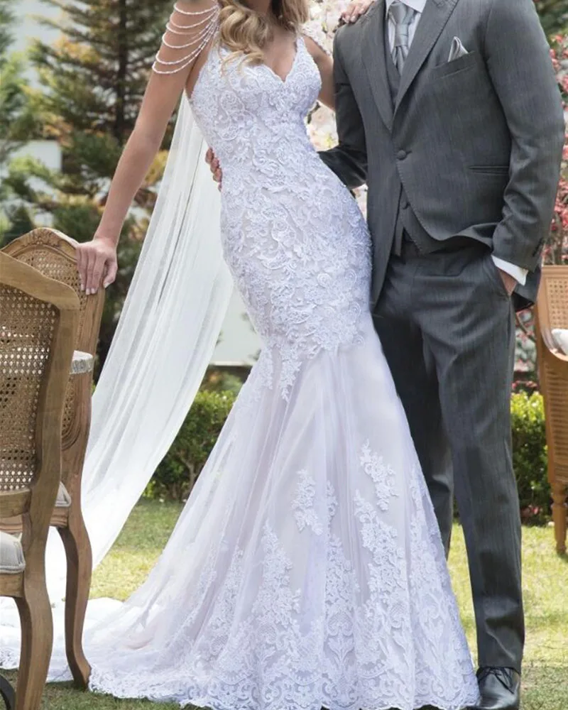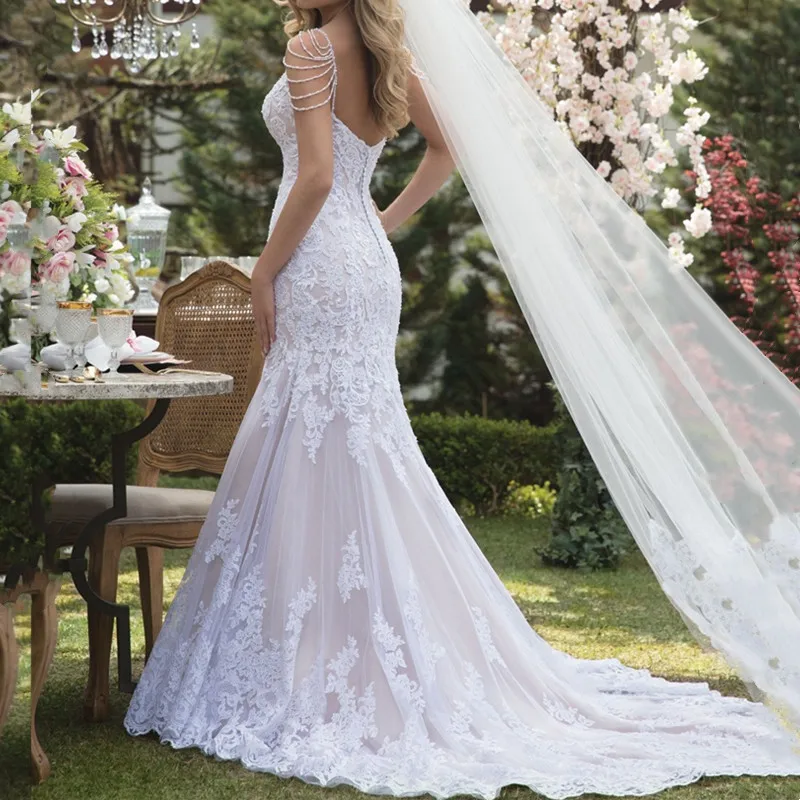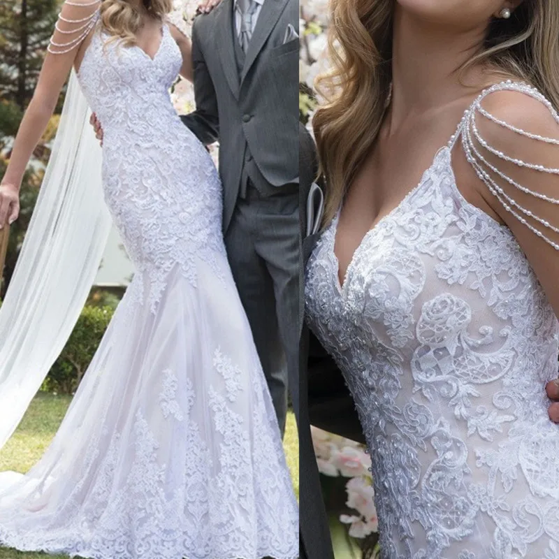 Кружевное свадебное платье-Русалка Vestido de noiva, свадебное платье на тонких бретелях с жемчугом, Элегантное свадебное платье для невесты, 2021