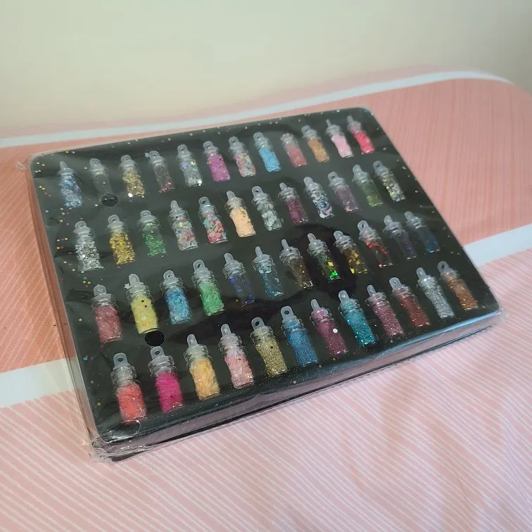 O molde é excelente. Um ótimo tamanho. Os brilhos são em frascos pequenos, mas atende as expectativas. Chegou antes do prazo.