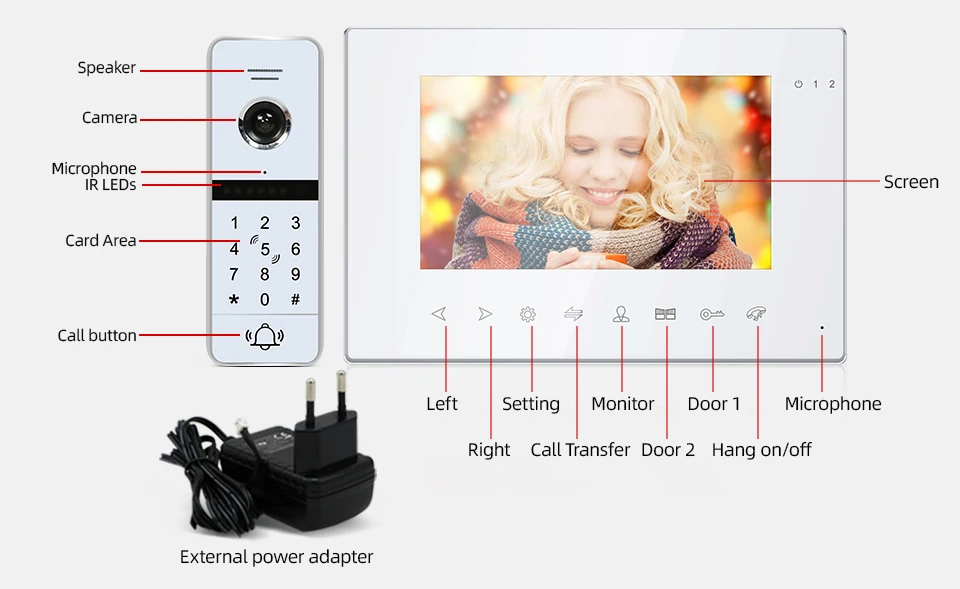 Модель:1 шт. монитор 86714(Главный монитор)Монитор 84714AHD, 2 шт.(Ведомый монитор, мы отправляем Серебряный по умолчанию)Дверной звонок 84207EPCAHD1.3, 1 шт.(Разблокировка паролем и разблокировка IC-карты, разрешение 1,3 МП)
