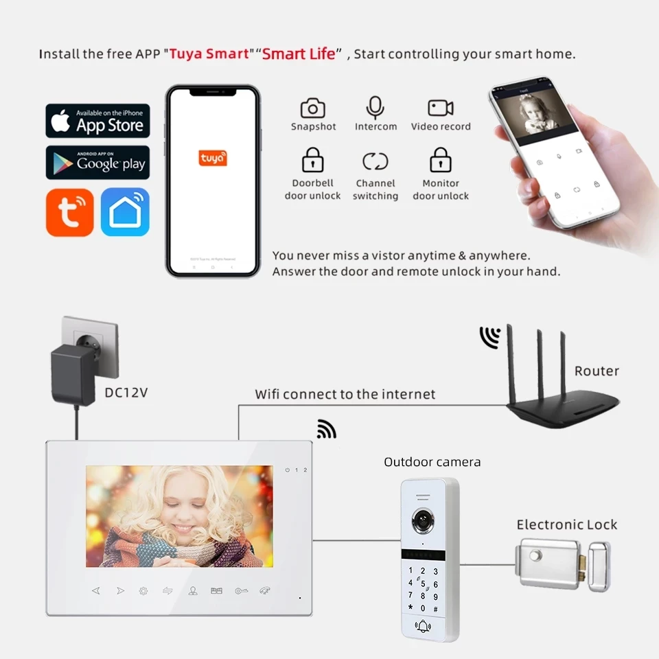 Подключитесь к приложению Tuya smarthome, вы можете дистанционно управлять монитором, снимать фото или видеозапись. Вы можете поговорить со своими посетителями и разблокировать их.Все эти действия, вы можете закончить их своим мобильный телефон.