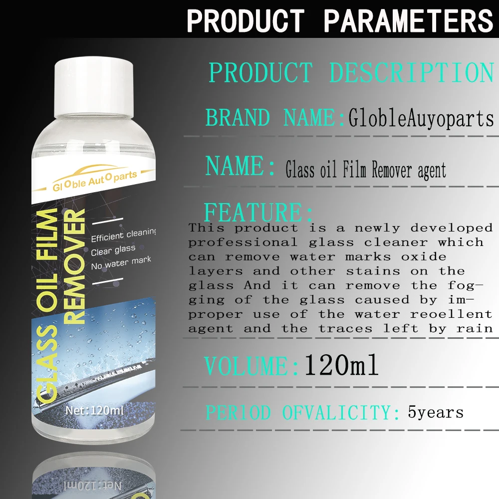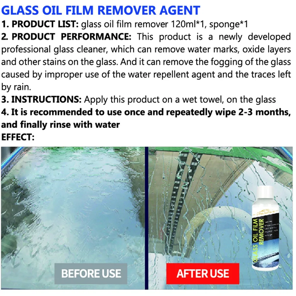 Средство для удаления жира из стекла 1. Список продуктов: стеклянный масляный Съемник пленки 120 мл * 1, губка * 1 2. Характеристики продукта: Этот продукт является недавно разработанным профессиональным стеклоочистителем, который может удалить следы от воды, оксид la'flyer и другие пятна на стекле. И он может убрать запотевание стекла, вызванное неправильным использованием водоотталкивающего средства и следов, оставленных дождем. 3. Инструкция: нанесите данное изделие на влажное полотенце. На стекло 4. Рекомендуется использовать один раз и многократно протирать 2-3 месяца и наконец краску водой