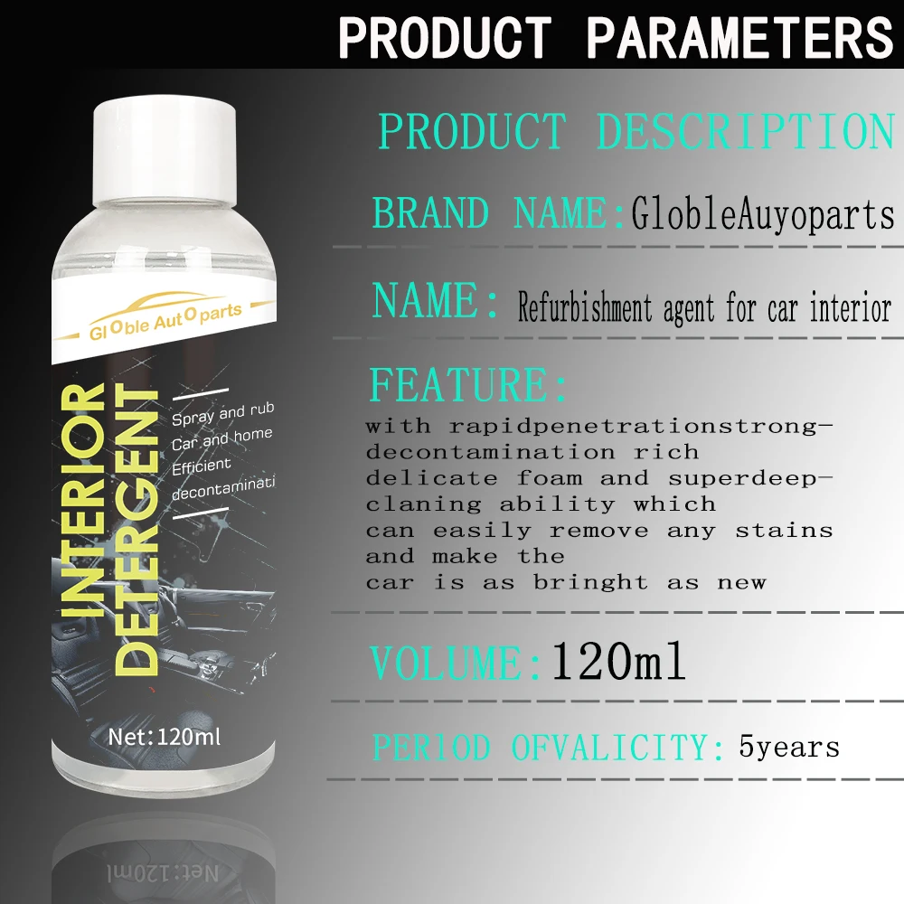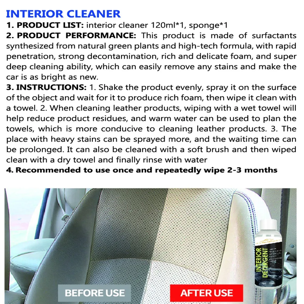 Очиститель салона 1. Список продуктов: interiorcleaner120 мл * 1,spong1 2. Характеристики продукта: Этот продукт изготовлен из поверхностно-активных веществ, синтезированных из натуральных зеленых растений, высокотехнологичной формулы, с быстрой проникающей, сильной, обеззараживающей, richad деликатной пеной и сверхглубокой очищающей способностью, который может легко удалить любые пятна и сделать автомобиль таким же ярким, как новый 3. Инструкция: 1. Равномерно встряхните изделие, распылите его на поверхность предмета и дождитесь, пока он не получит рихпену, Thenwipe it clean with atowel.2 при чистке изделий из кожи, протирание влажным полотенцем поможет уменьшить остатки продукта. И теплую воду можно использовать для планирования полотенец, что больше способствует очистке кожи. 3. Место с тяжелыми пятнами можно распылять больше, а время ожидания можно продлить. Его также можно очистить мягкой щеткой, а затем протереть в воде