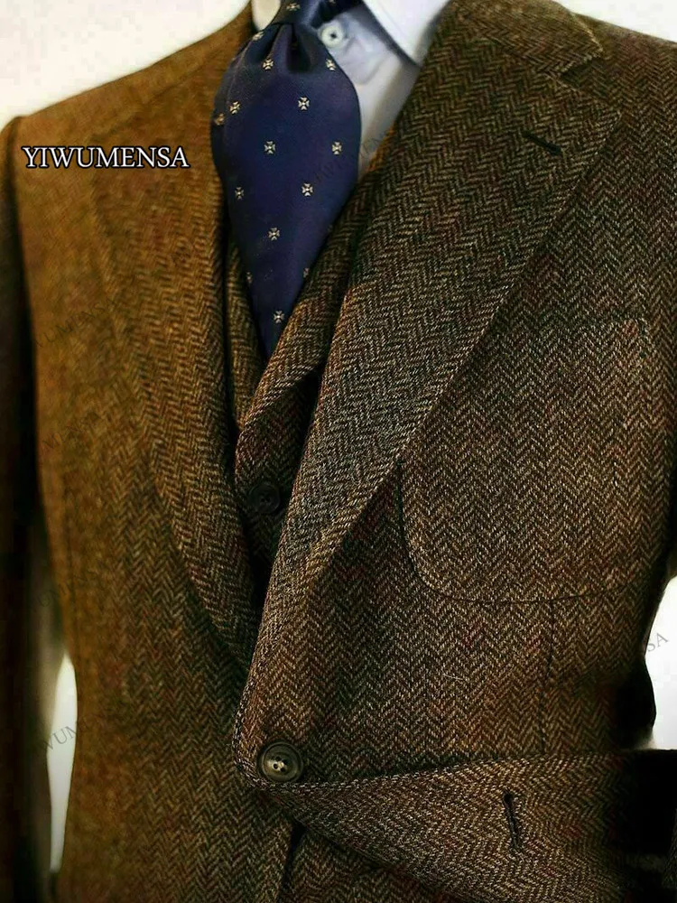 Костюм твидовый Мужской приталенный, шерстяной Блейзер в елочку, с вырезом на лацкане, для свадьбы, деловой костюм для жениха, коричневый, 2021