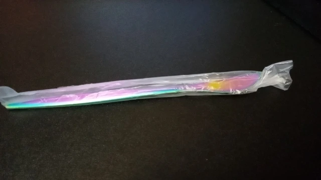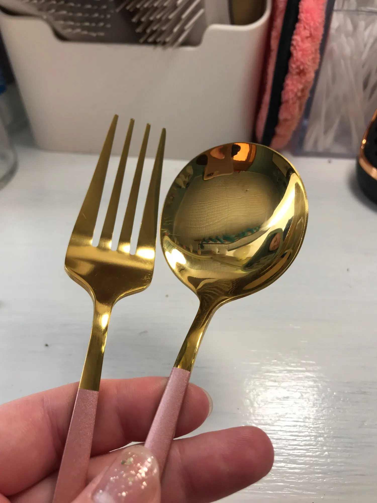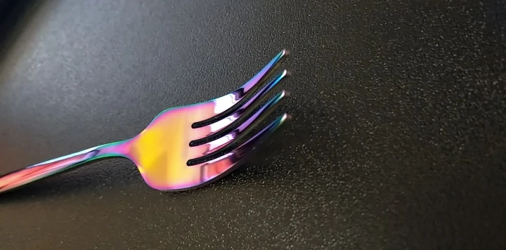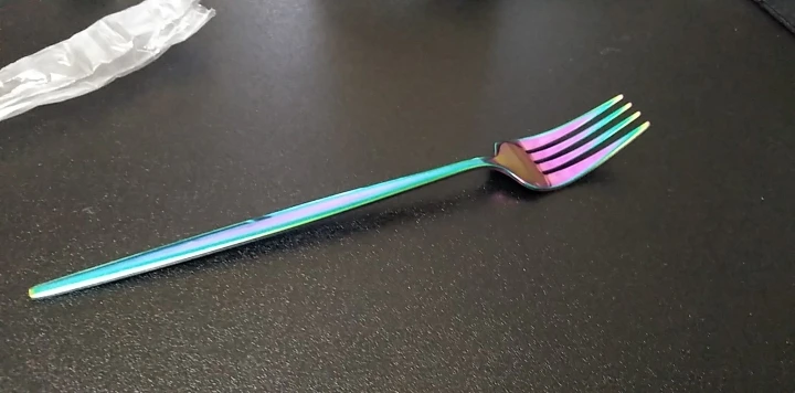 Вилка пришла с дефектом, глубокая царапина на лицевой стороне. Крашеные ручки вилок стираются, приходят уже с просветами и недокрасами, поэтому полностью стальную вилку рекомендую на повседневное использование. Ну а крашеные - это праздничный вариант, они нарядно смотрятся.