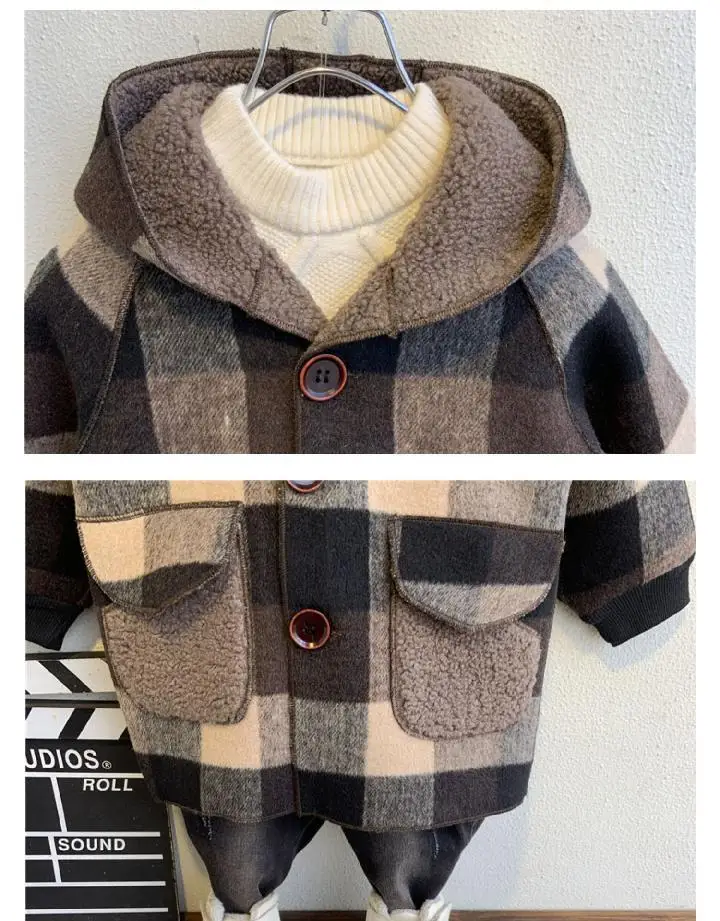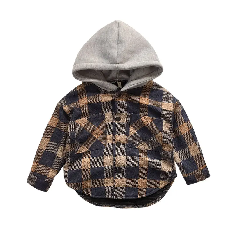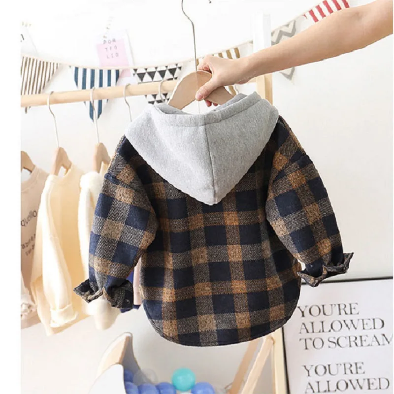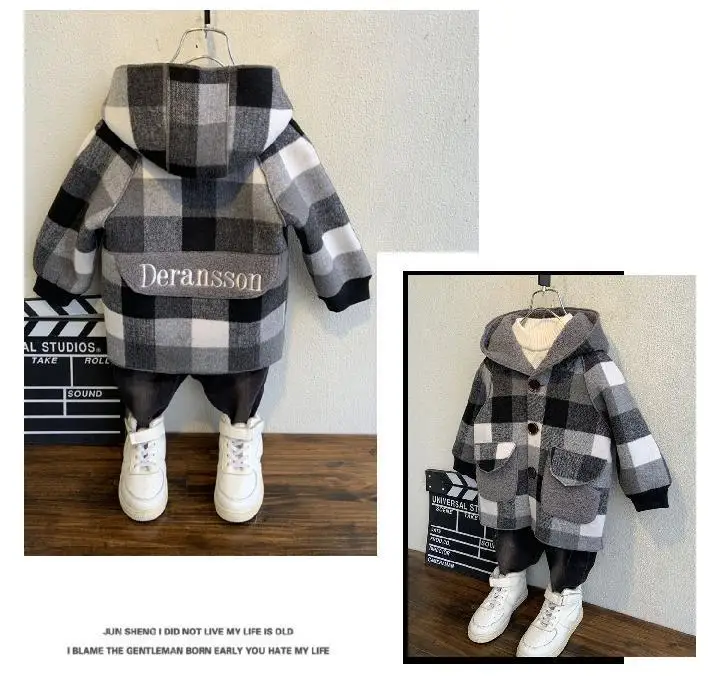 Осенняя модная детская верхняя одежда в клетку, шерстяное пальто для мальчиков, утепленная куртка с капюшоном, ветровка для мальчиков, детская одежда, пальто, От 2 до 6 лет