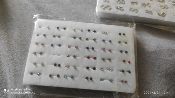 Всё как на фото, очень аккуратные, никаких зазубрин, такие же яркие! С серёжками ещё приходит пакетик прозрачных затычек для них.
