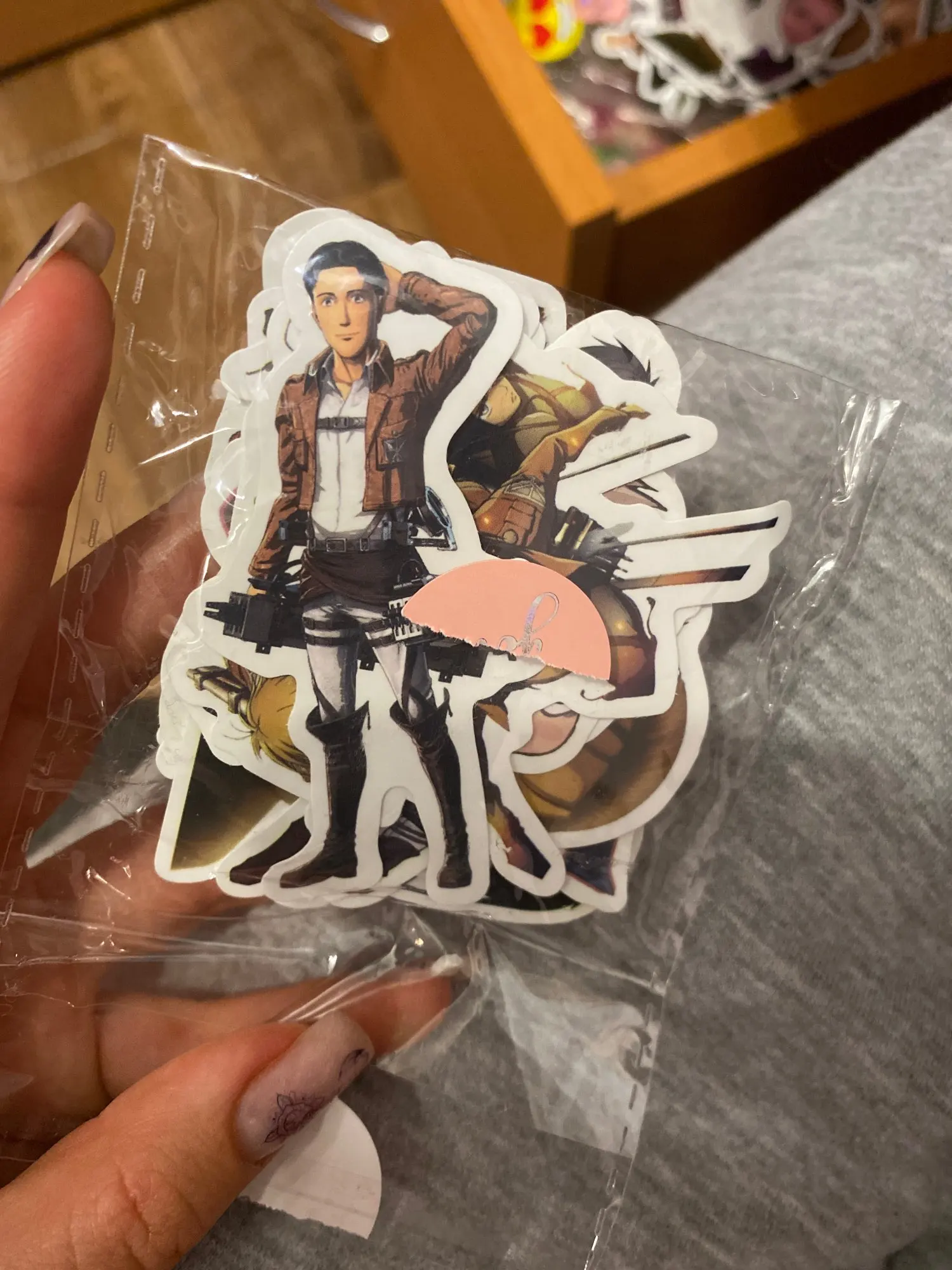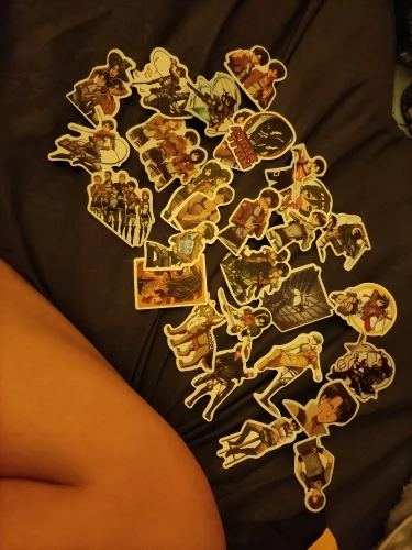 Очень хорошие наклейки, все 30 Очень много наклеек с Леви, хотелось бы немножко больше персонажей, но я не жалуюсь. Отдельная благодарочка за наклейку с Хисторией и Имир