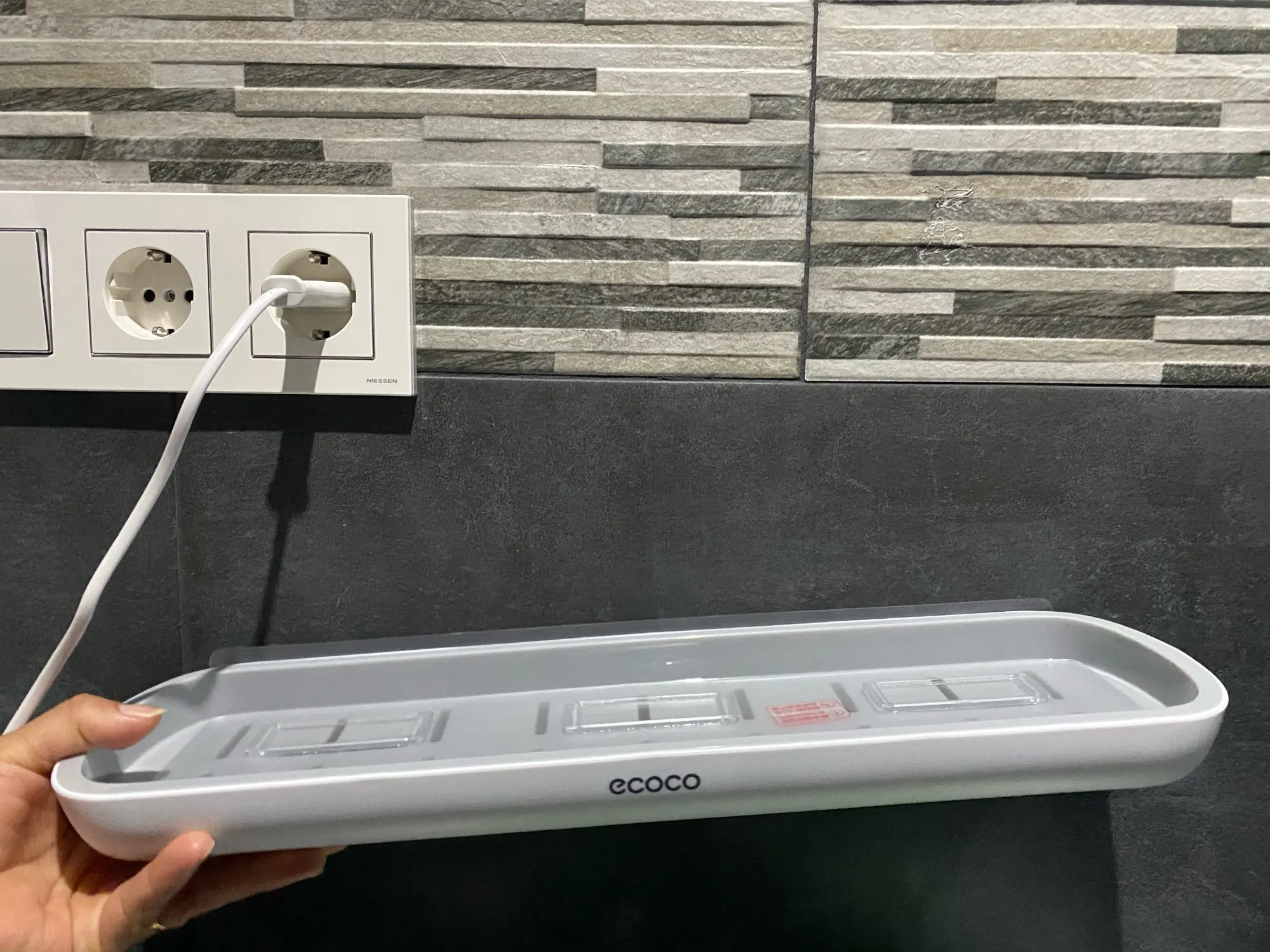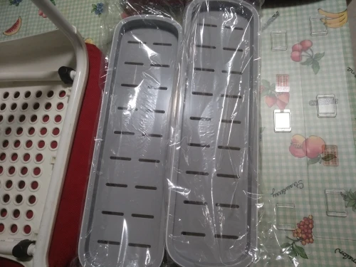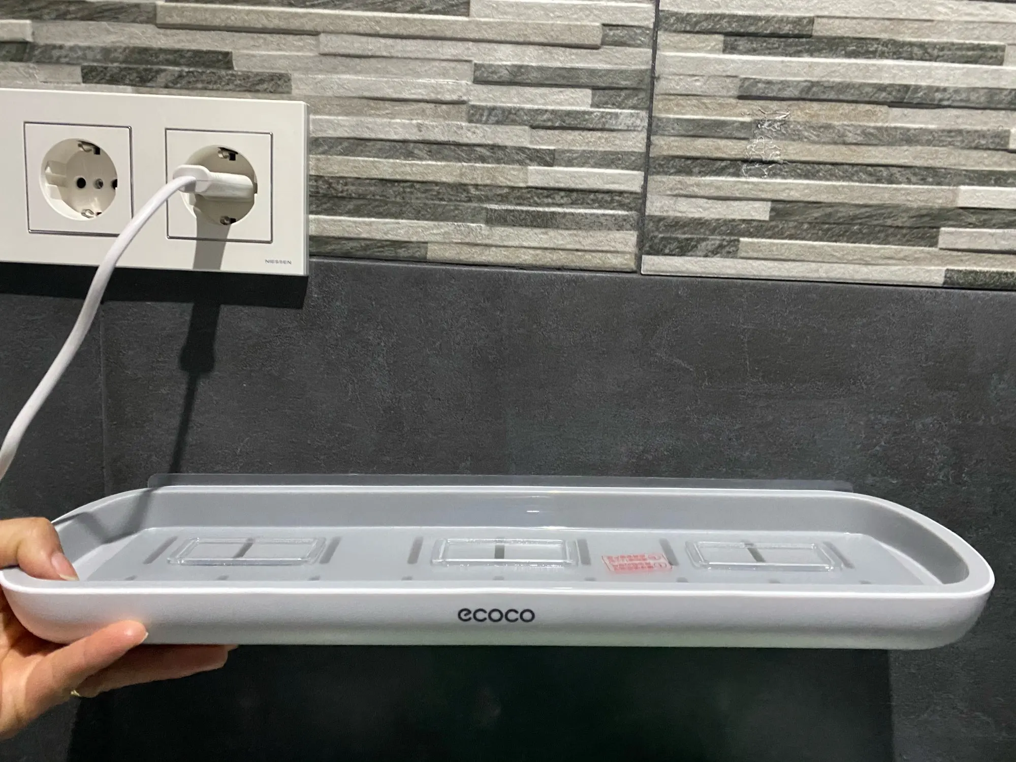 Полка как на фото, клейкие крючки находятся на одной ленте и немного не попадают в пазы, из-за чего лента идет волной. Не знаю, оправдана ли цена.