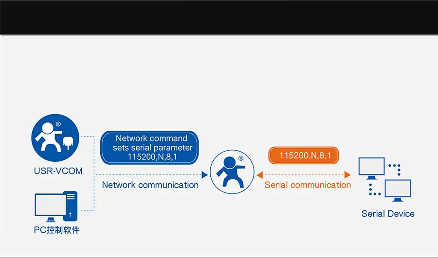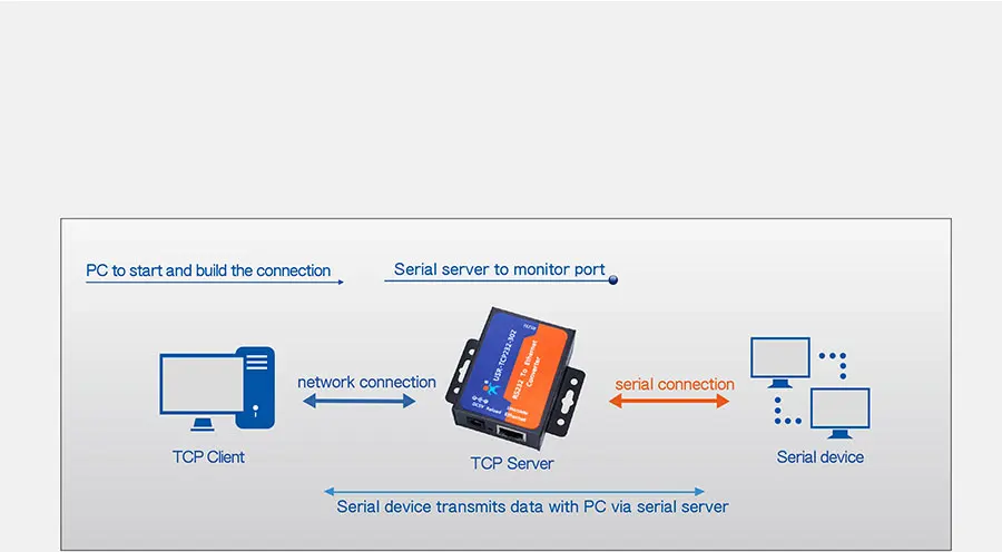 RS232 Преобразователь Ethernet USR-TCP232-302 контролировать заданный порт и ждет подключения Клиента TCP.Данные от серийного устройства передадут всем успешно подключенным клиентам TCP.