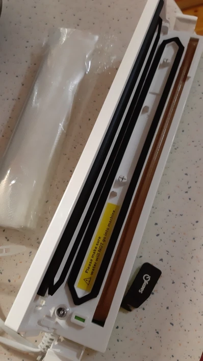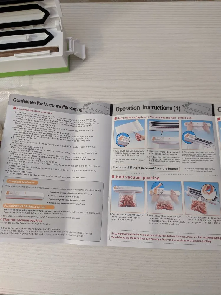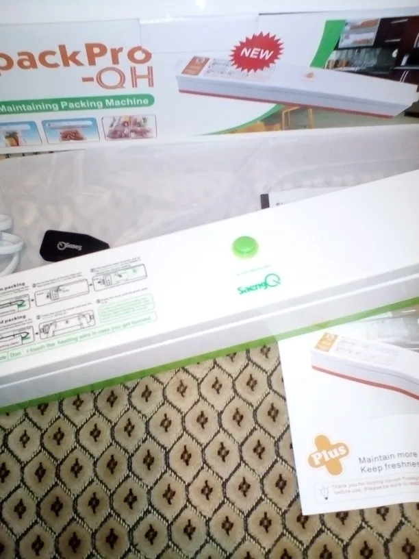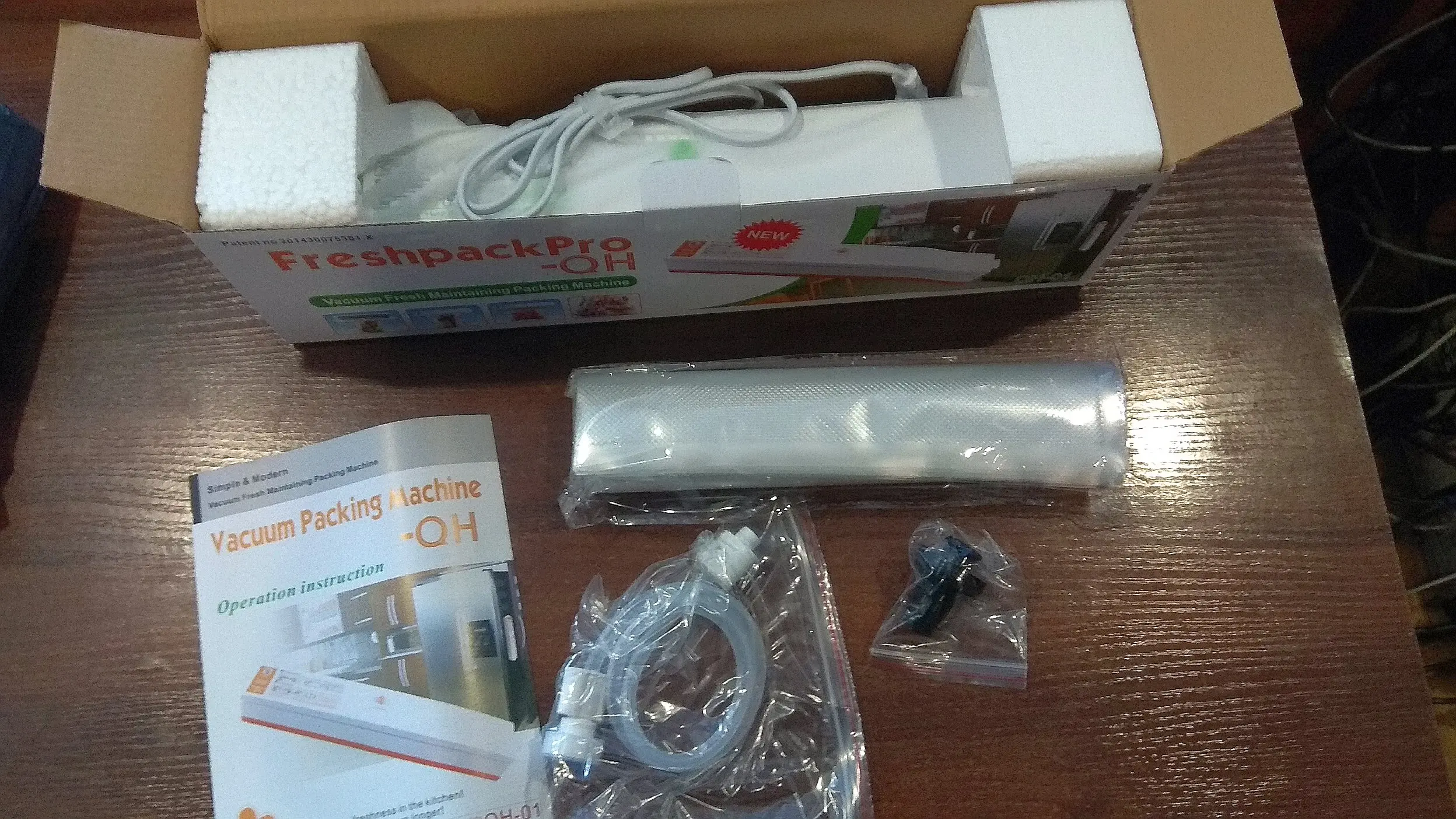 Супер! заказ получила через 2 дня! Курьер доставил прямо к дверям. В комплекте 15 пакетов, инструкция и резак.Упаковывает отлично, вакуумирует мощно.На фото аж печеньки полопались))Для просто запайки, нужно положить пакет на блестящую ленту, закрыть и прижать сверху руками ВСЮ поверхность.Загорится зеленый, когда загорится красный- готово! Для вакуумирования ложим пакет чуть за первую черную резинку, и нажимаем кнопку. Когда остановится- поднимаем резиновую пробочку посередине крышки- готово!