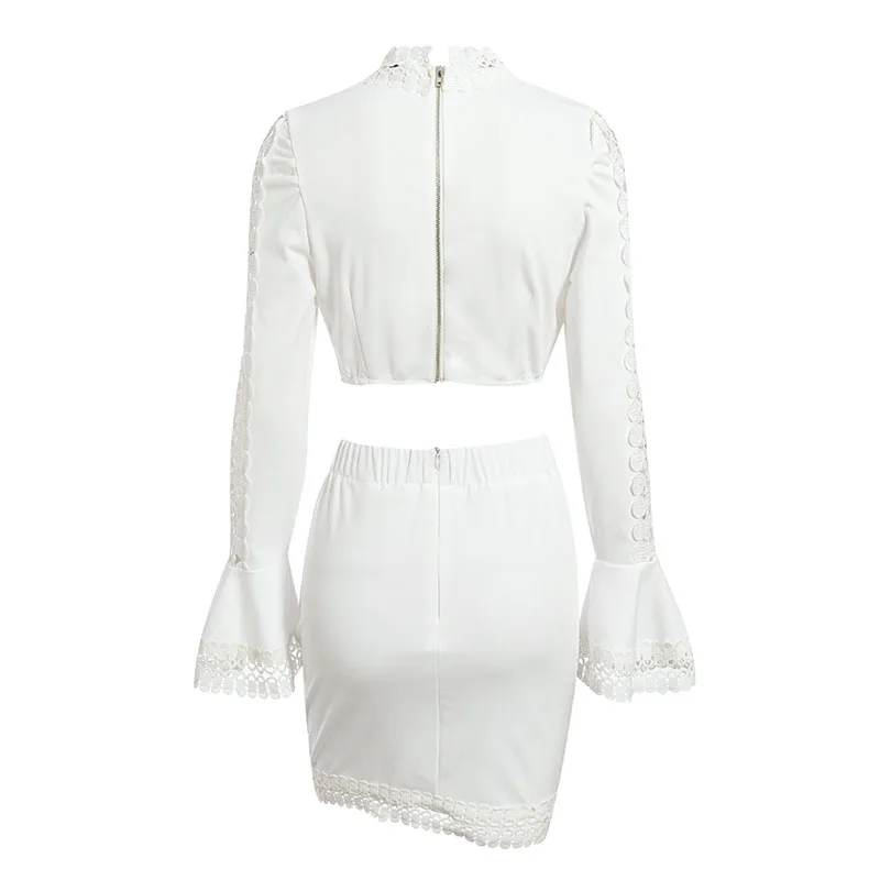 Missord Женский комплект из 2 предметов, модный кружевной однотонный белый укороченный топ с длинными рукавами + Сексуальная мини-облегающая юбка MS102