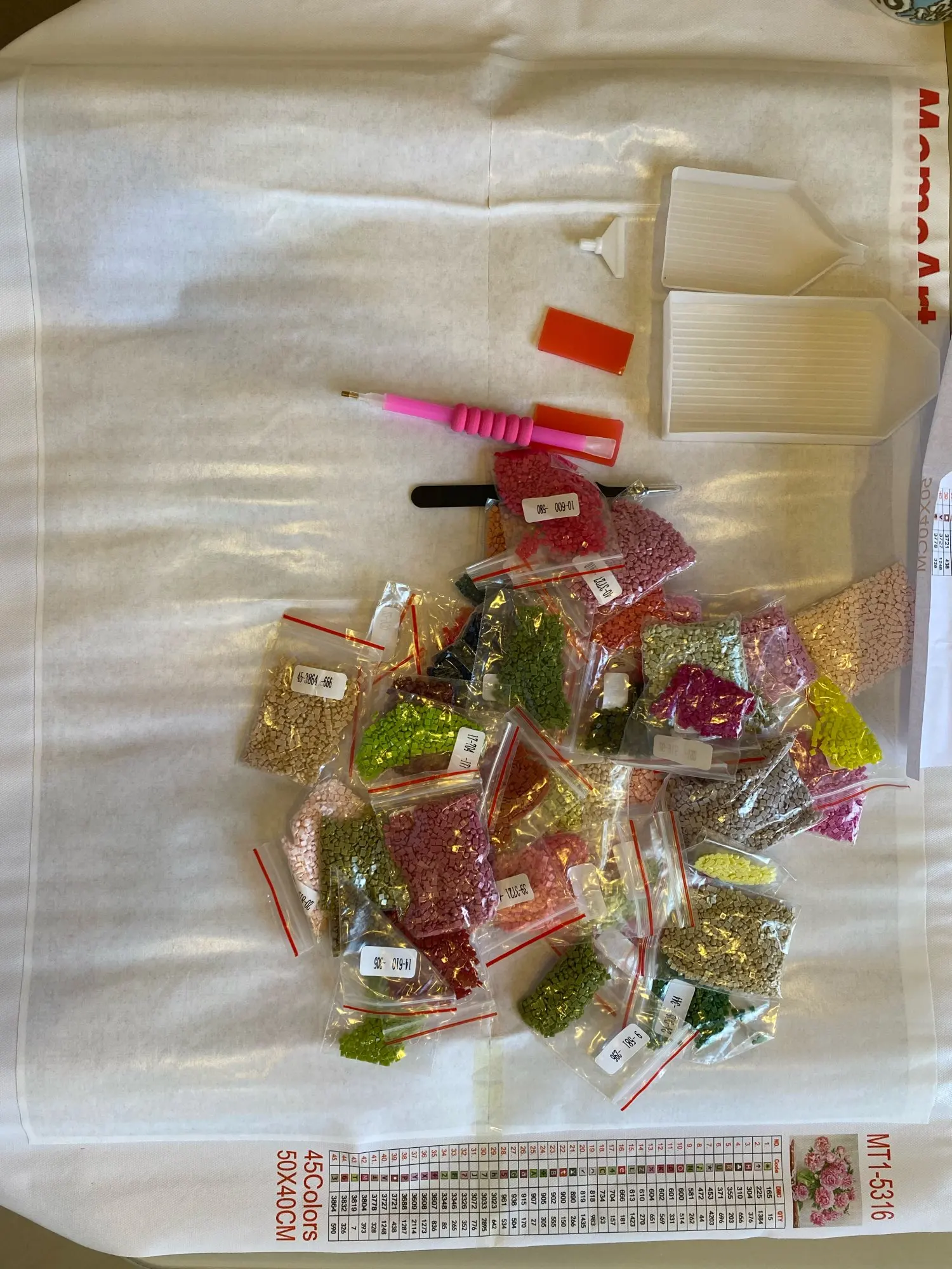 Быстрая отправка. Приехало за 2,5 недели. Полотно намотано на поролоновый валик и запечатано в плёнку. Стразы квадратные, разложены по зип-пакетам. Выкладка полная. Инструменты идут в комплекте. Так же есть дополнительный ключ по цветам распечатанный на листе.
