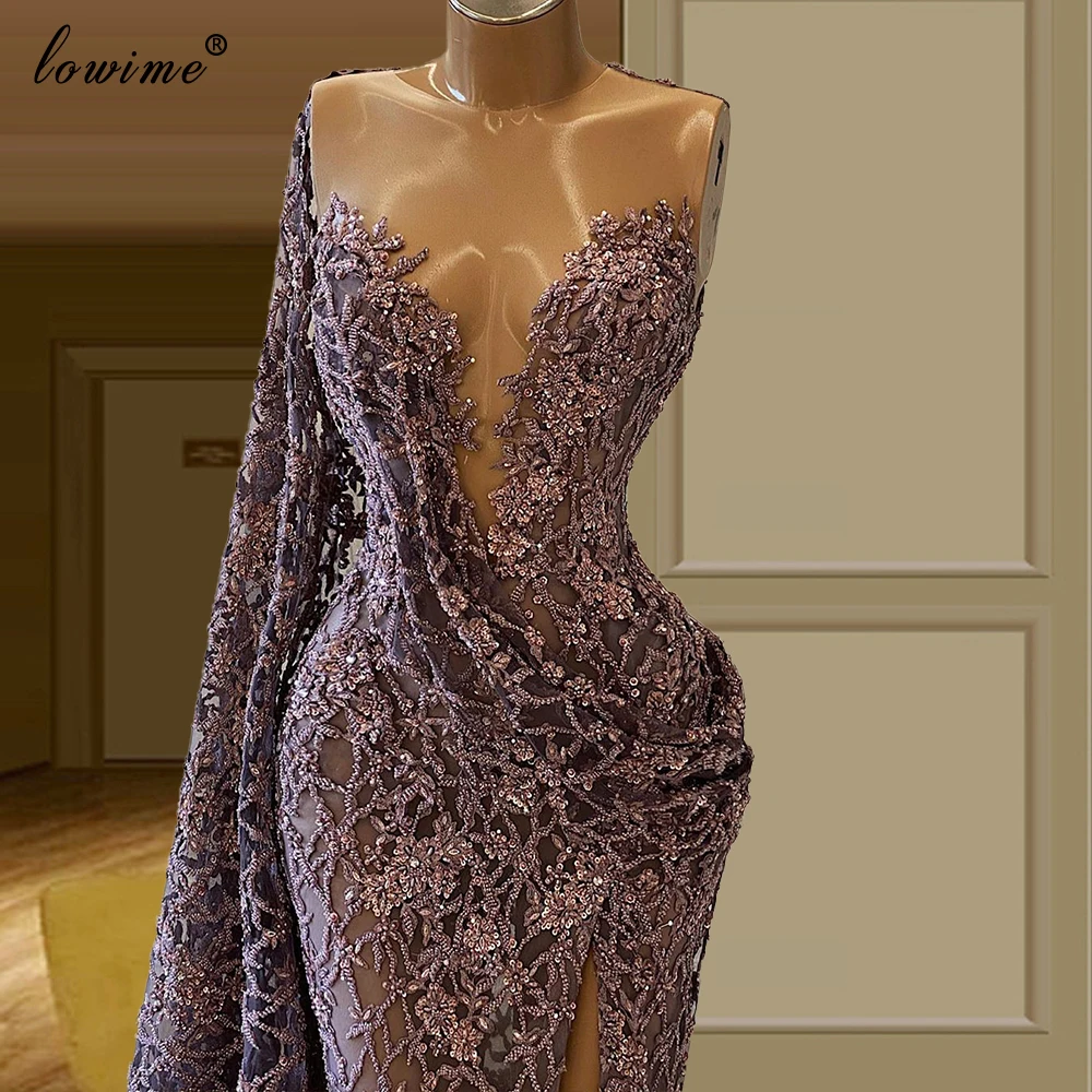 Размера плюс пурпурное кружевное вечернее платье длинное платье на одно плечо Дубай Бисер вечерние платья русалки Платья знаменитостей, комплект вечерней одежды