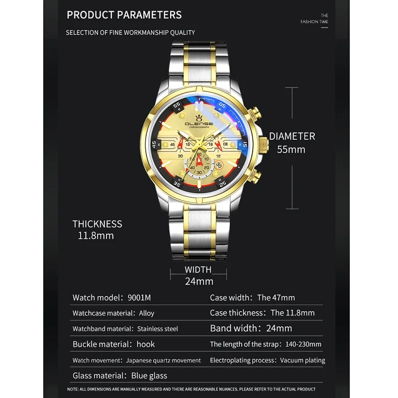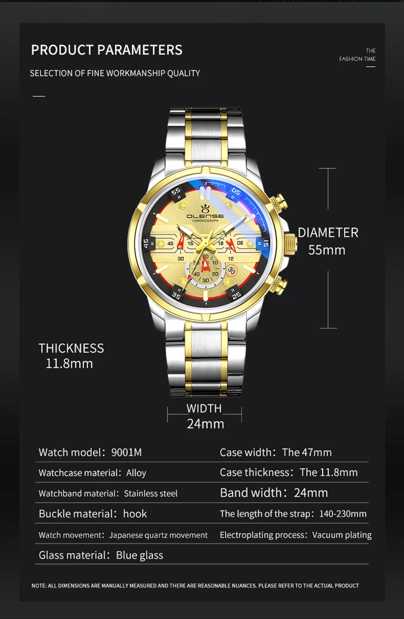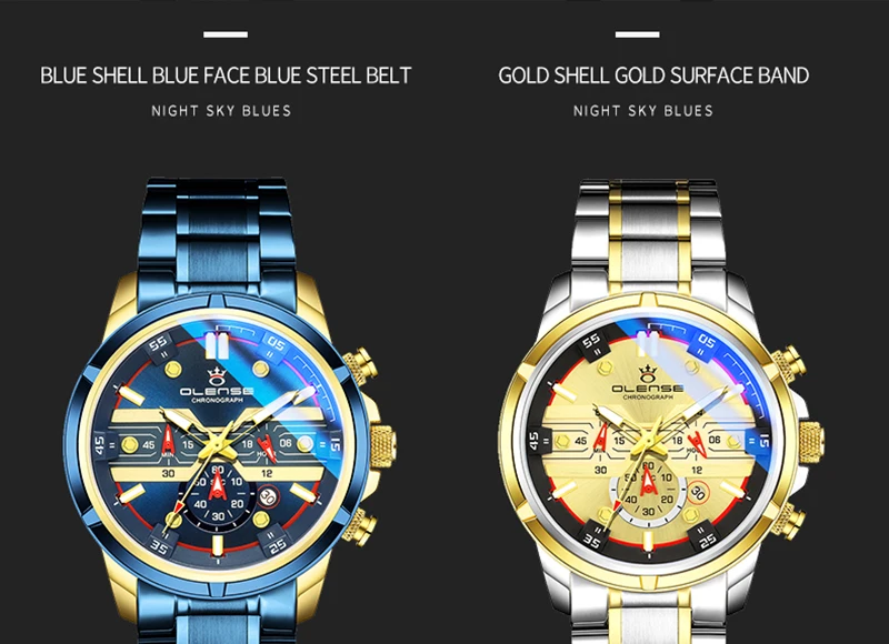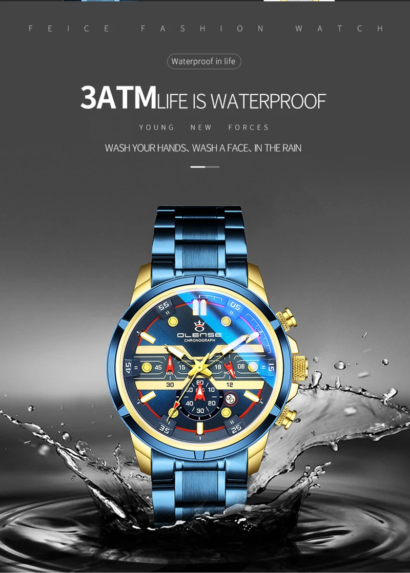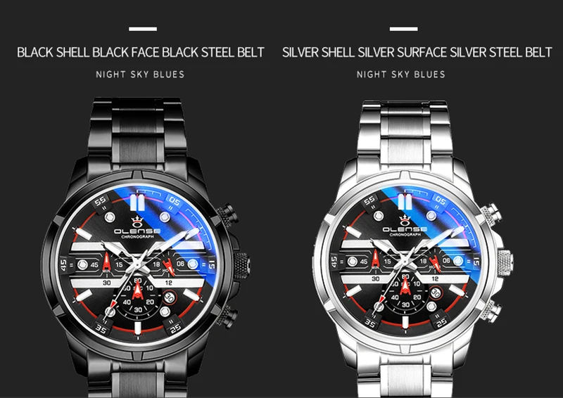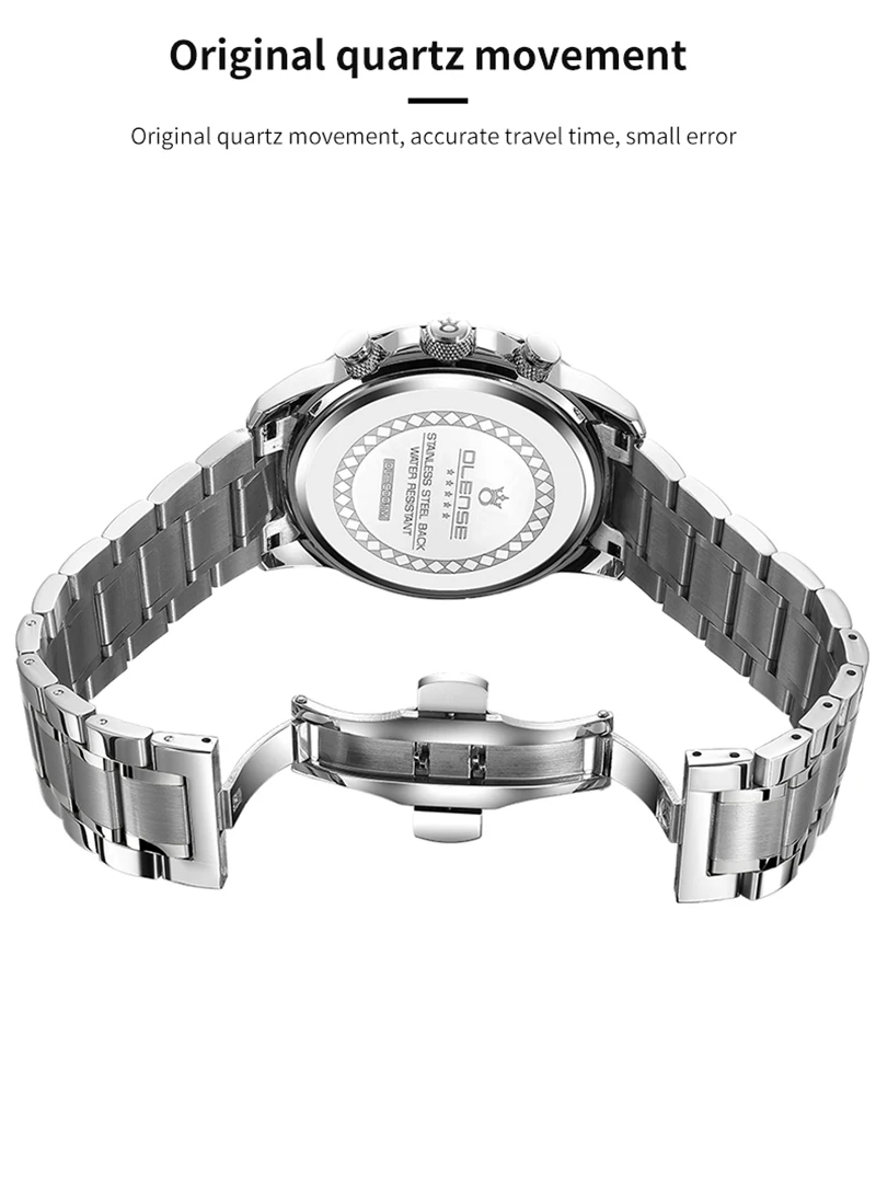 Мужские часы OLENSE 2021 из нержавеющей стали, многофункциональные кварцевые часы с синим светлым стеклом, повседневные водонепроницаемые часы с датой и хронографом