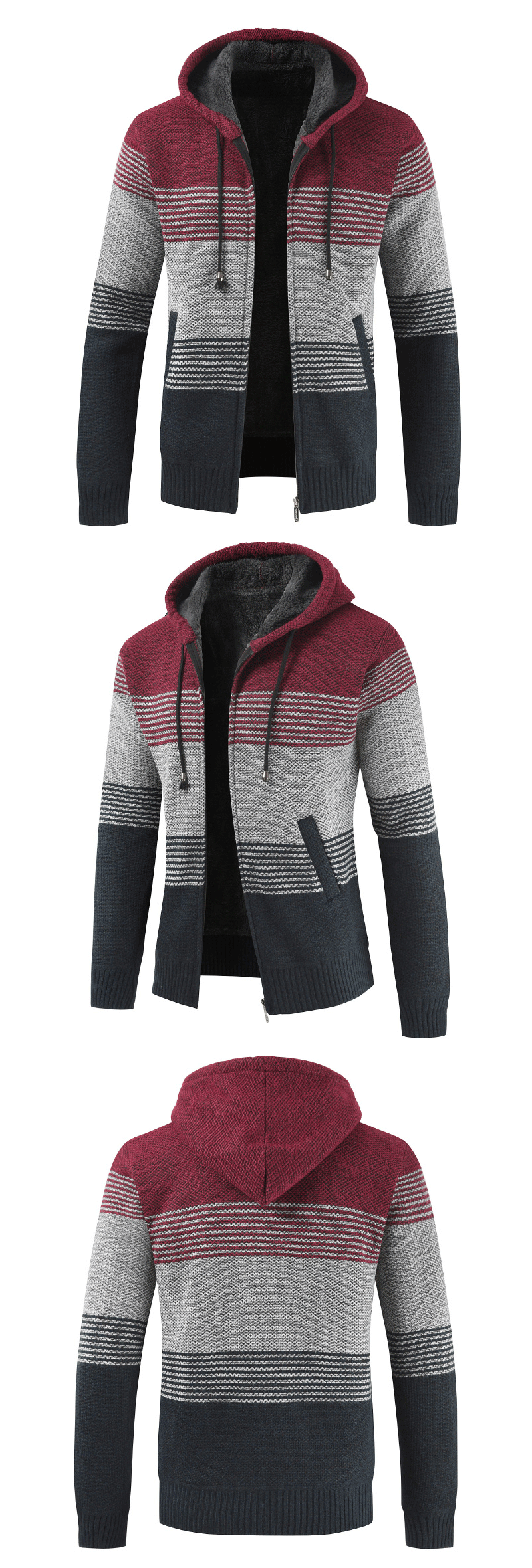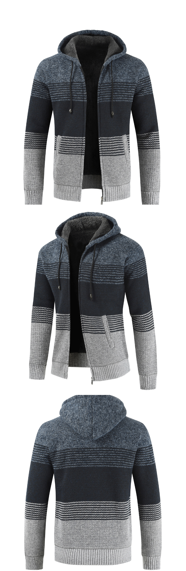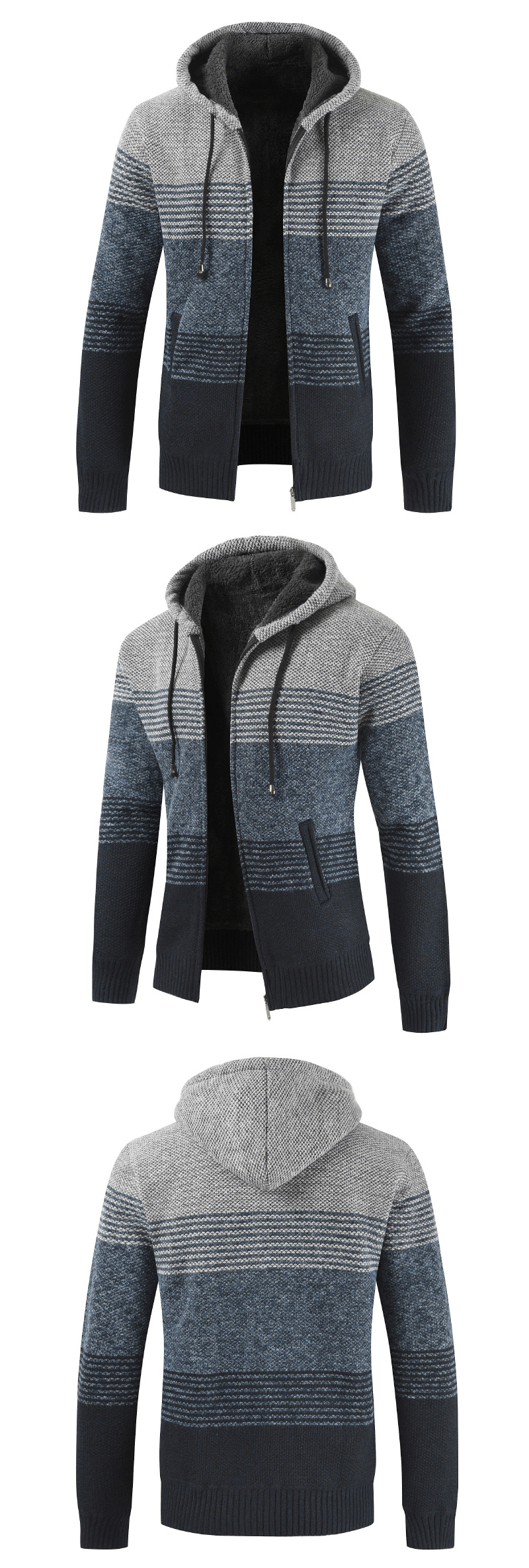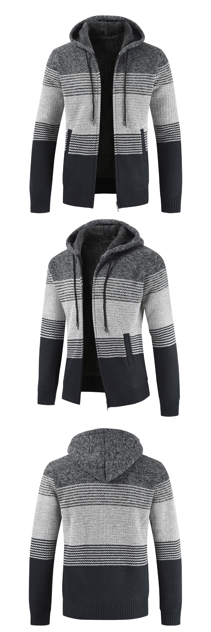 Мужской утепленный кардиган с капюшоном, полосатый флисовый свитер ...