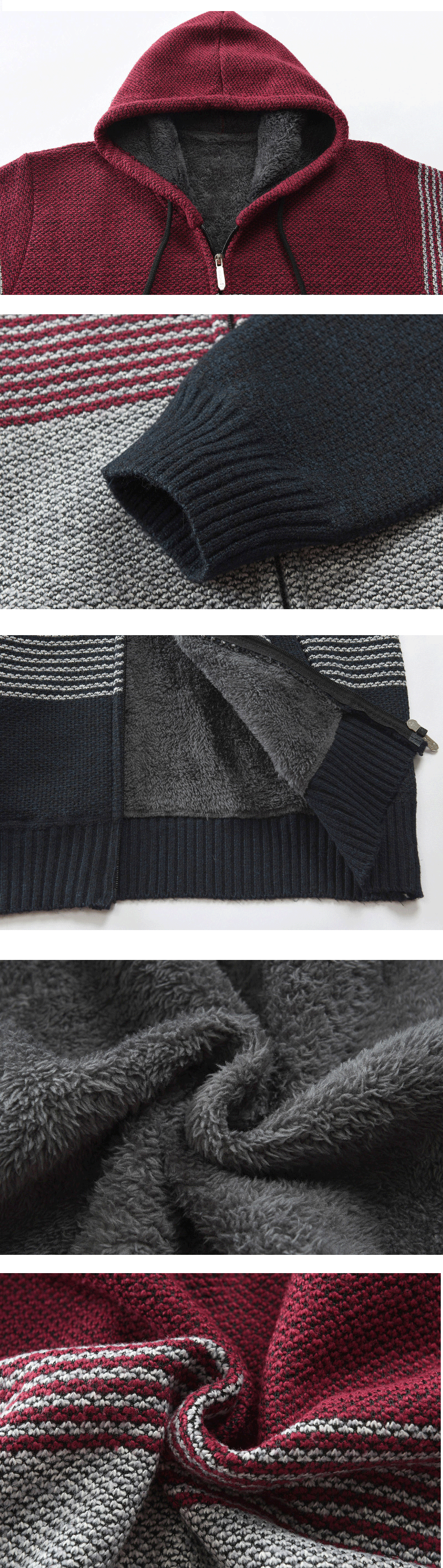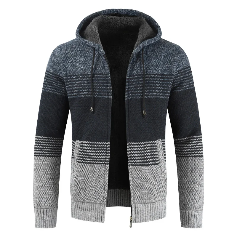 Мужской утепленный кардиган с капюшоном, полосатый флисовый свитер с шерстяной подкладкой и молнией, на зиму, 2020