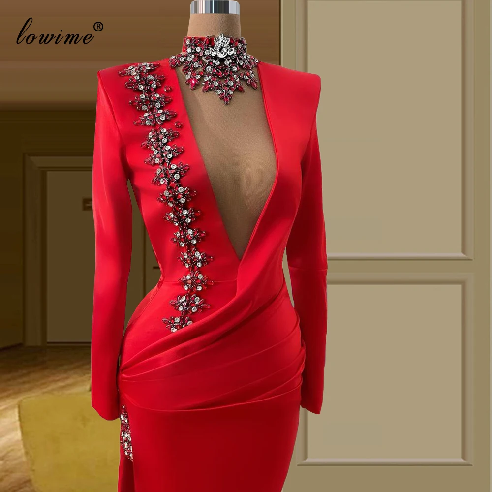 Великолепные красные вечерние платья с длинными рукавами 2021 Дубай Кристаллы платья знаменитостей вечерняя одежда Vestido De Fiesta De Boda