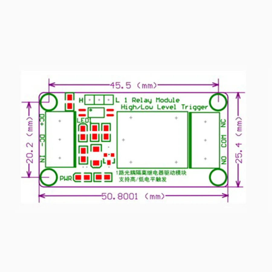 1. В модуле используется реле подлинного качества, нормально открытые интерфейсы, Максимальная нагрузка: 250 В/10 А переменного тока, 30 В/10 А постоянного тока; 2. С использованием изоляции оптопары SMD, способности к вождению, стабильной производительности; Пусковой ток 5 мА; 3, напряжение 5 В 4. Модуль может быть настроен на запуск высокого или низкого с помощью перемычек; 5. Устойчивая к отказу конструкция, даже если управляющая линия сломана, реле не будет работать; 6, индикатор питания (зеленый), индикатор состояния реле (красный) 7. Удобный дизайн интерфейса, все интерфейсы доступны через Проводные клеммы с прямым подключением, очень удобно 8, Размер модуля: 50 мм * 26 мм * 18,5 мм (Д * Ш * В) 9 с четырьмя отверстиями для крепежных болтов, отверстие 3,1 мм, шаг 44,5 мм * 20,5 мм Два, интерфейс модуля: 1, DC +: положительный источник питания ( 2, DC-: отрицательный 3, IN: может быть реле управления высокого или низкого уровня Релейные выходы: 1. НЕТ: нормально открытые релейные интерфейсы, реле перед подвешиванием, оттяните с помощью COM 2, COM: общий интерфейс реле 3, NC: нормально замкнутые релейные интерфейсы, реле перед COM, пустая стойка тяги