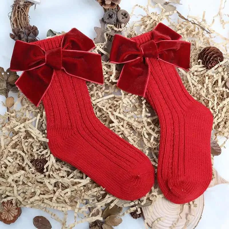 Милые хлопковые носки для маленьких девочек с бархатным бантом, мягкие зимние теплые однотонные гольфы до коленакороткие носки для младенцев, аксессуары для малышей