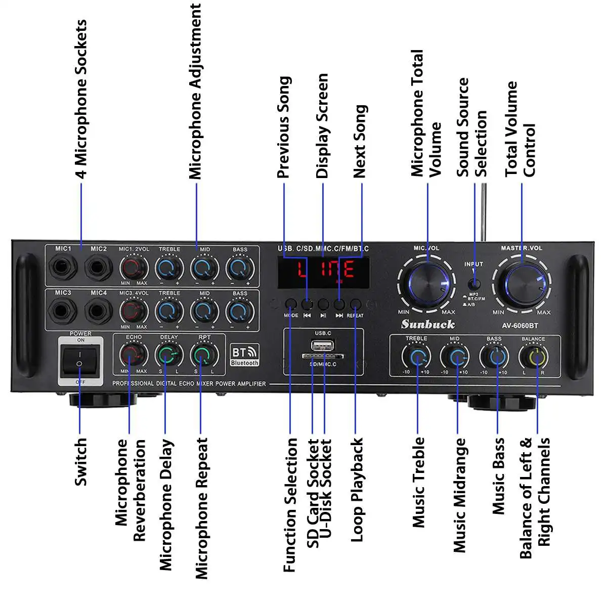 Особенности:-Мини HIFI Цифровой bluetooth аудио усилитель мощности.-TF карта, AUX, U диск, MP3 формат воспроизведения, поддержка bluetooth беспроводного подключения.-Поддерживает fm-стерео радио.-Поддержка 4 способа вход для микрофона.-С высокими частотами, басами и регулятором громкости, очень прост в использовании.-Низкое Искажение обеспечивает более четкий, сильный и мощный звук.-5 выходной канал.-С функцией дистанционного управления.-Модернизированная Высокая мощность 2000 Вт-Питание постоянного/переменного тока, подходит для домашнего использования.-Он может автоматически переключать напряжение.-Малый вес, светильник.