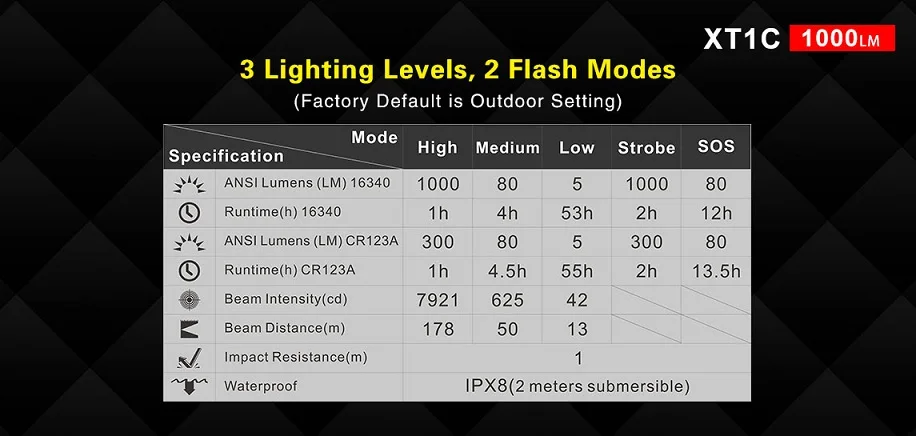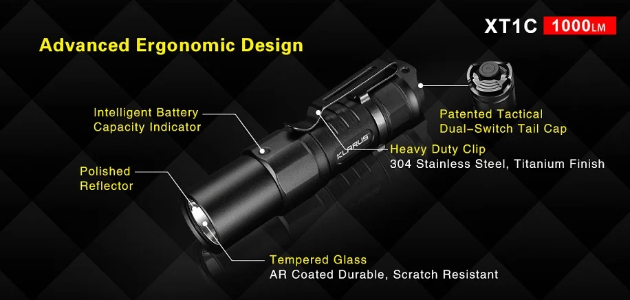 • Запатентованная тактическая Хвостовая крышка с двойным переключателем управления; Невизуальное тактильное управление одной рукой с интуитивно понятным управлением для работы на низком светильник.