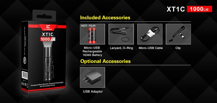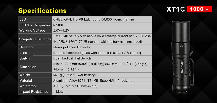 • Совместимые батареи: 1x16340 с 3A + разрядной мощностью или 1 x CR123A. (KLARUS 16GT-70UR Micro-USB аккумуляторная батарея