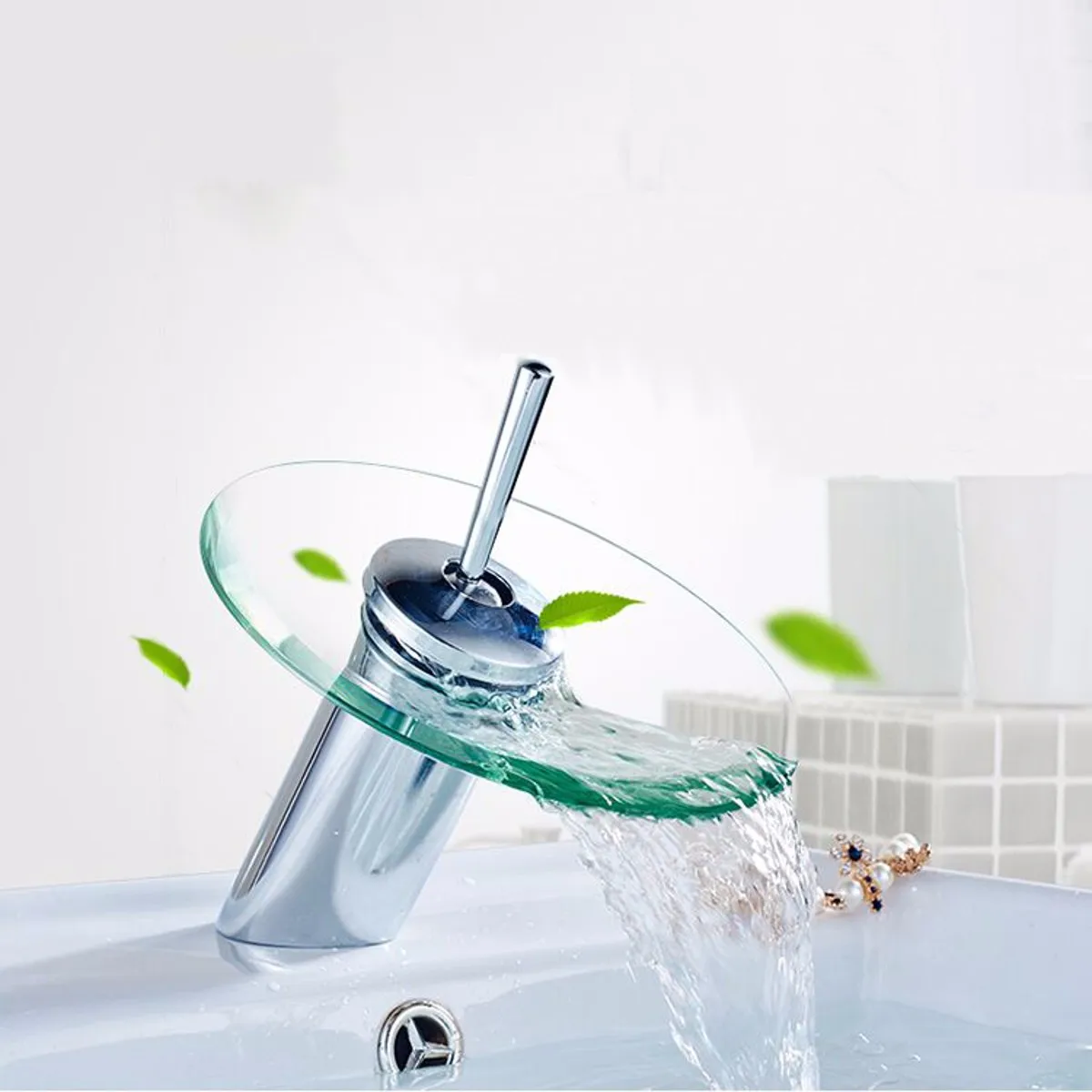 -Однорычажный смеситель для раковины из цельного стекла с водопадом-Конструкция наклона крана выпадает из воды, а поверхность сделана из толстого плексигласа, личного вкуса и моды, ручка может вращаться на 360 градусов.-Горячая и холодная вода. 2 подушки покрывают небольшие аксессуары, два шланга 50 см, диаметр стеклянного диска 18 см, эффекты водопада, придавая Вам различное ощущение купания с горячей и холодной водой!Спецификация:Материал: медь, стеклоОтделка: полированный хромСердечник клапана: керамический сердечник клапанаСтруктура: ОднослойнаяФункциональные категории: смесительный кранТип: смеситель для раковиныАксессуары: две 50 см впускные трубы и монтажные аксессуары