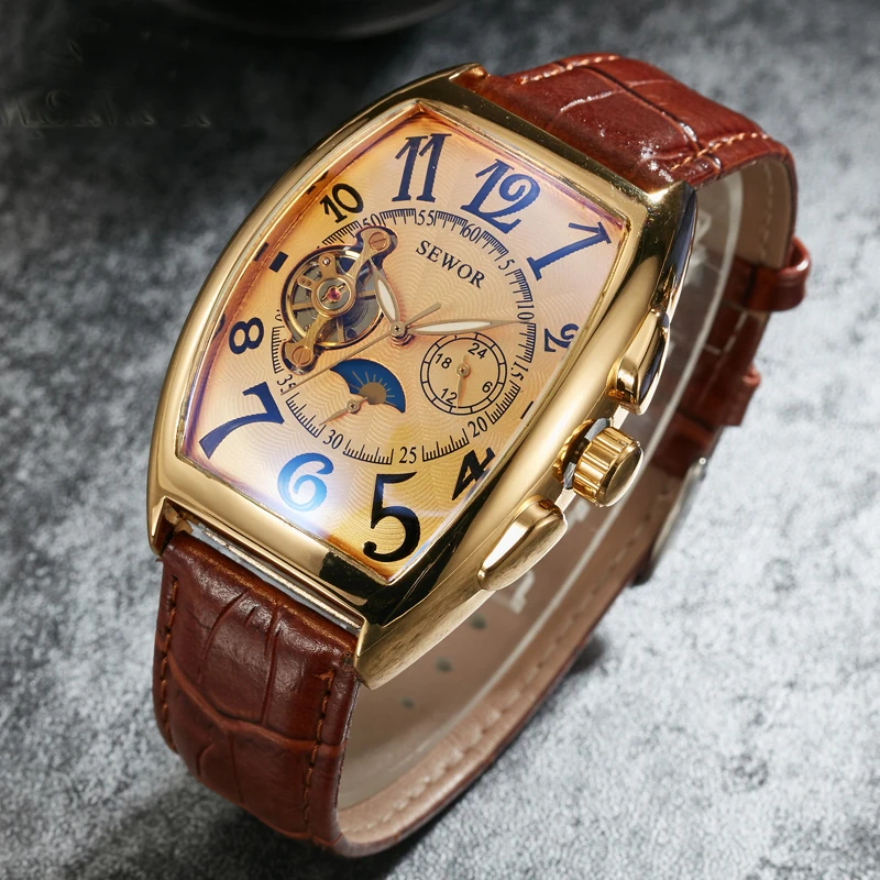 Часы наручные SEWOR Мужские механические, модные роскошные золотистые автоматические, с Мон фазой и турбийоном, маленькие секунды