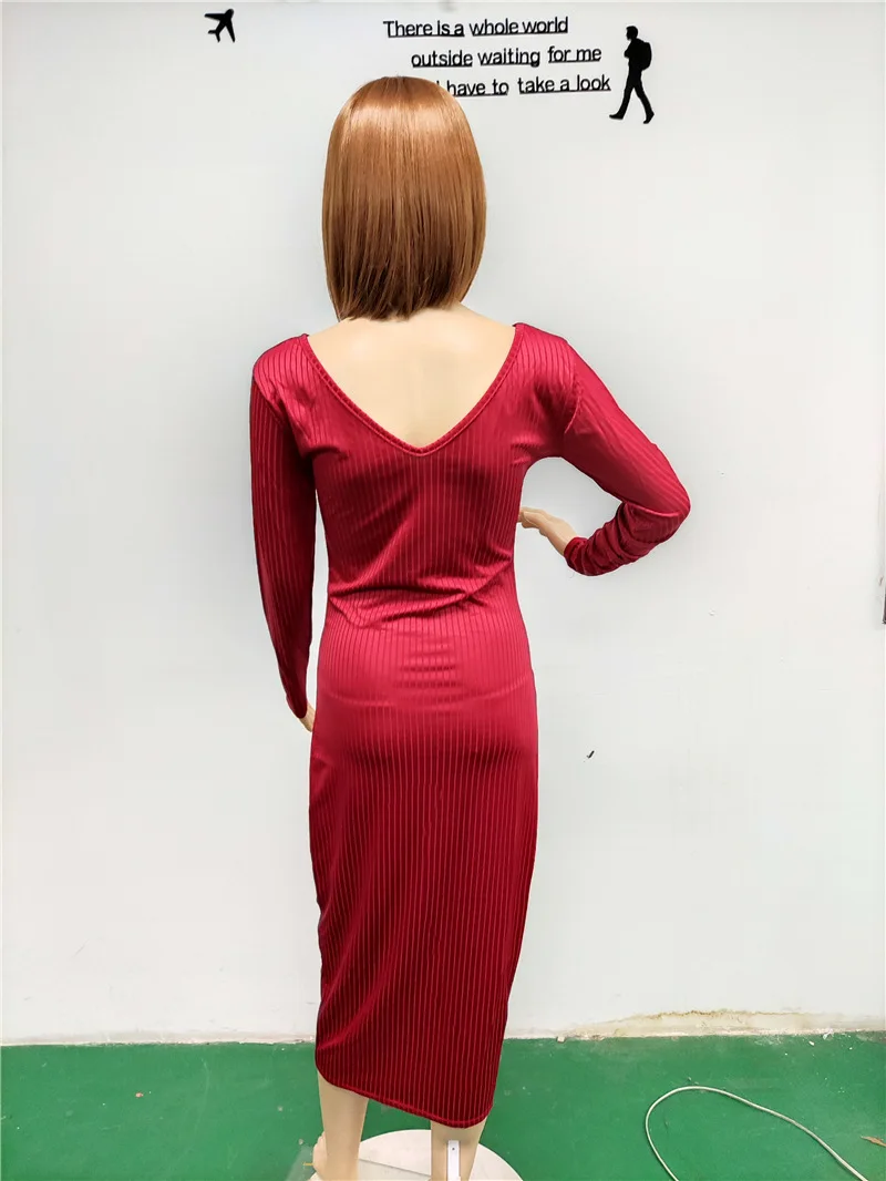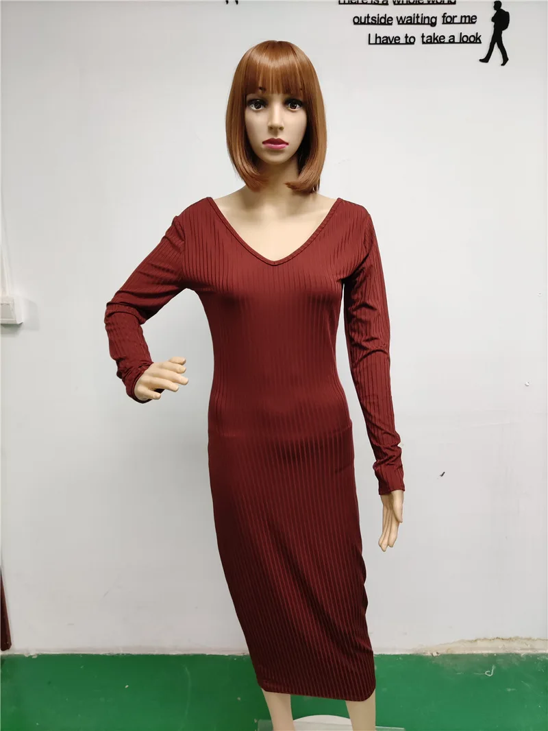 Женское трикотажное платье-карандаш с V-образным вырезом и длинным рукавом