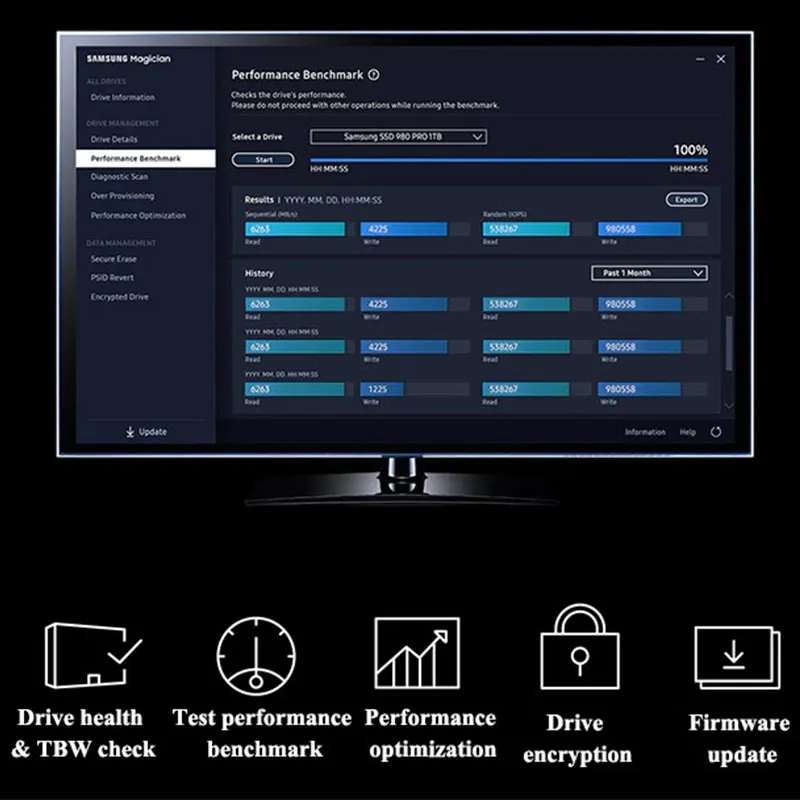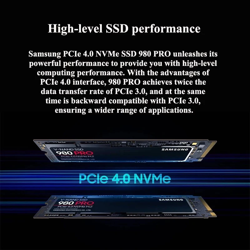 Место для хранения: 250 ГБ = приблизительно 200-240 ГБ 500 ГБ = Приблизительно 440-490 ГБ ТБ = приблизительно 880-980 ГБ Высокопроизводительный SSD-накопитель следующего уровня: Используйте твердотельный накопитель Samsung 980 PRO PCIe 4,0 NVMe для вычислений следующего уровня Максимальная скорость: 980 PRO поднимает планку для твердотельных накопителей NVMe, обеспечивая скорость чтения до 6900 МБ/с. Выигрышная комбинация: разработанная для хардкорных геймеров и высокотехнологичных пользователей, модель 980 PRO предлагает высокопроизводительную полосу пропускания и пропускную способность для сверхмощных приложений в играх, графике, аналитике данных и т. д. Высокоэффективный твердотельный накопитель M.2: модель 980 PRO поставляется в компактном форм-факторе M.2 2280, что позволяет оптимизировать энергоэффективность и идеально подходит для создания высокопроизводительных вычислительных систем Надежная Тепловая Регулировка: для обеспечения стабильной работы в 980 PRO используется никелевое покрытие, помогающее управлять уровнем нагрева контроллера и этикеткой теплораспределителя для обеспечения эффективного теплового контроля чипа NAND Умное тепловое решение: благодаря передовому алгоритму термоконтроля Samsung 980 PRO самостоятельно управляет нагревом и обеспечивает долговечность и надежность, минимизируя колебания производительности при длительном использовании Вспышка SAMSUNG MAGICIAN: набор удобных для пользователя инструментов помогает поддерживать накопитель в курсе, контролировать состояние и скорость накопителя и даже повышать производительность Всенародный номер бренд флэш-памяти 1: все прошивки и компоненты, включая всемирно известные DRAM и NAND Samsung, производятся своими силами, что позволяет полностью интегрировать качество, которому вы можете доверять