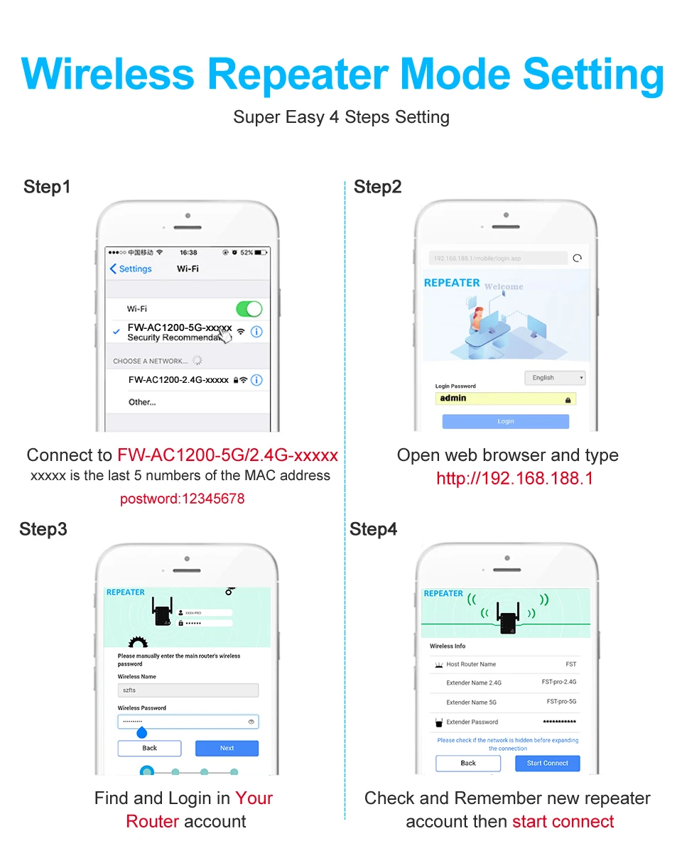 Wi-Fi-ретранслятор 2,4G, 5G Гц, 300 Мбитс, 802.11AC 1200
