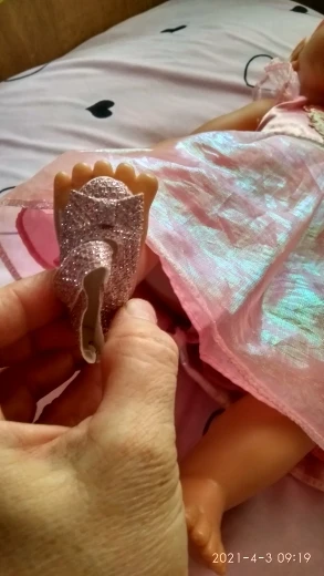 Туфли сделаны из тряпки , сыпятся блестки ужасно, подошва не резина, а что-то типа пенопласта. На ножку 5 см сели отлично,для Детей. Если только одеть и больше не снимать и не трогать куклу. Конечно попробую постирать, может блестки уйдут или не будут сыпаться