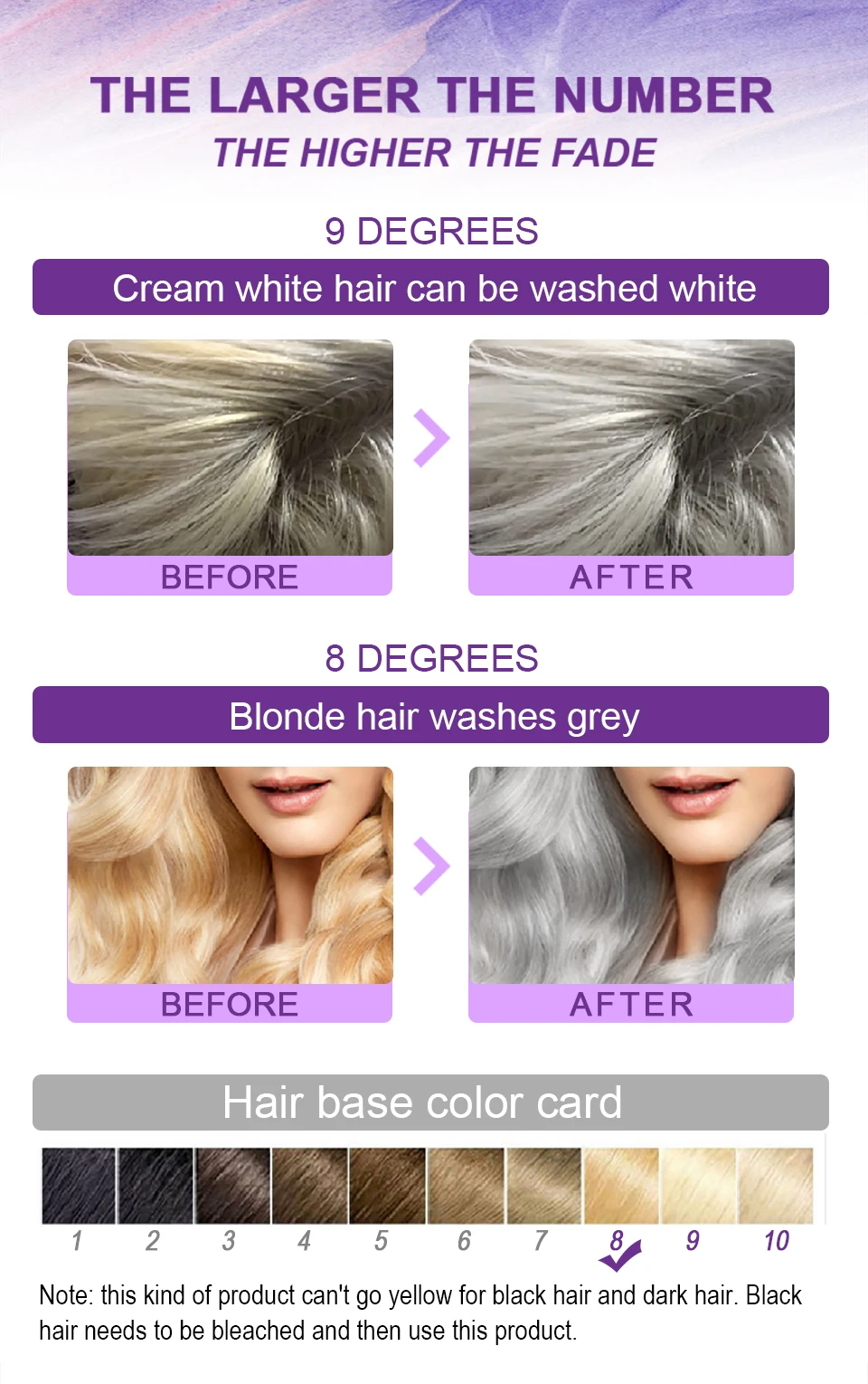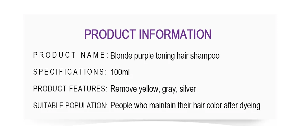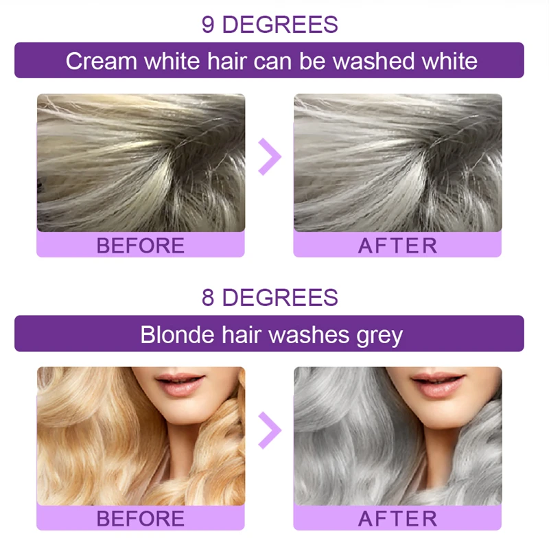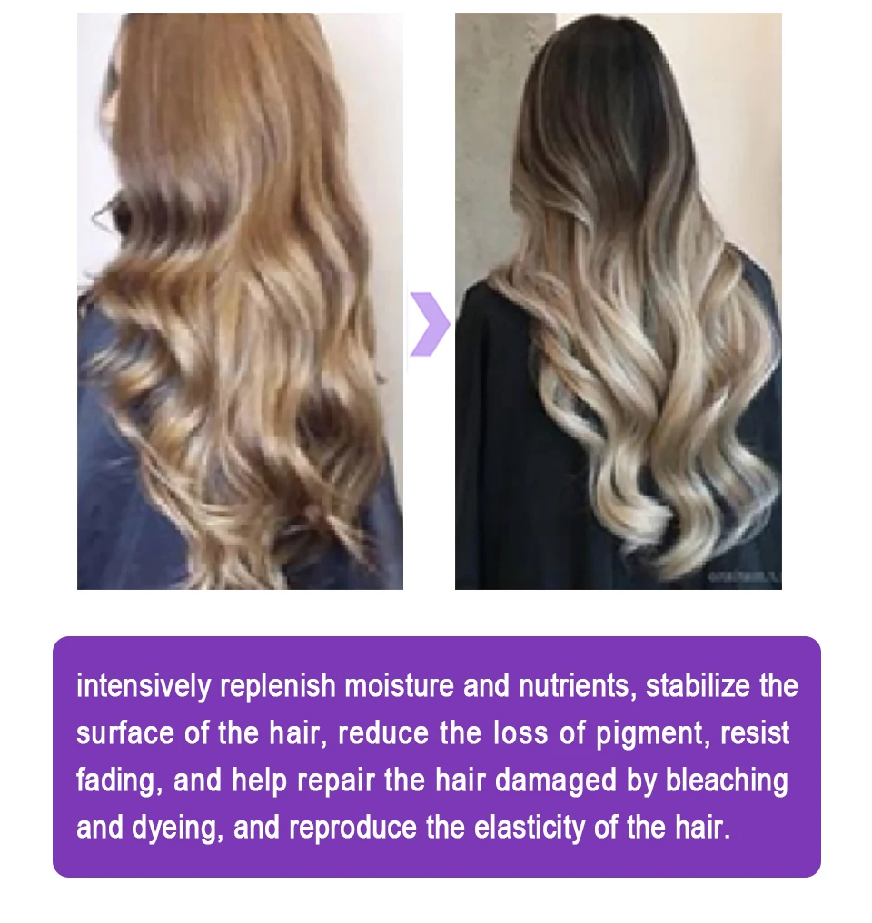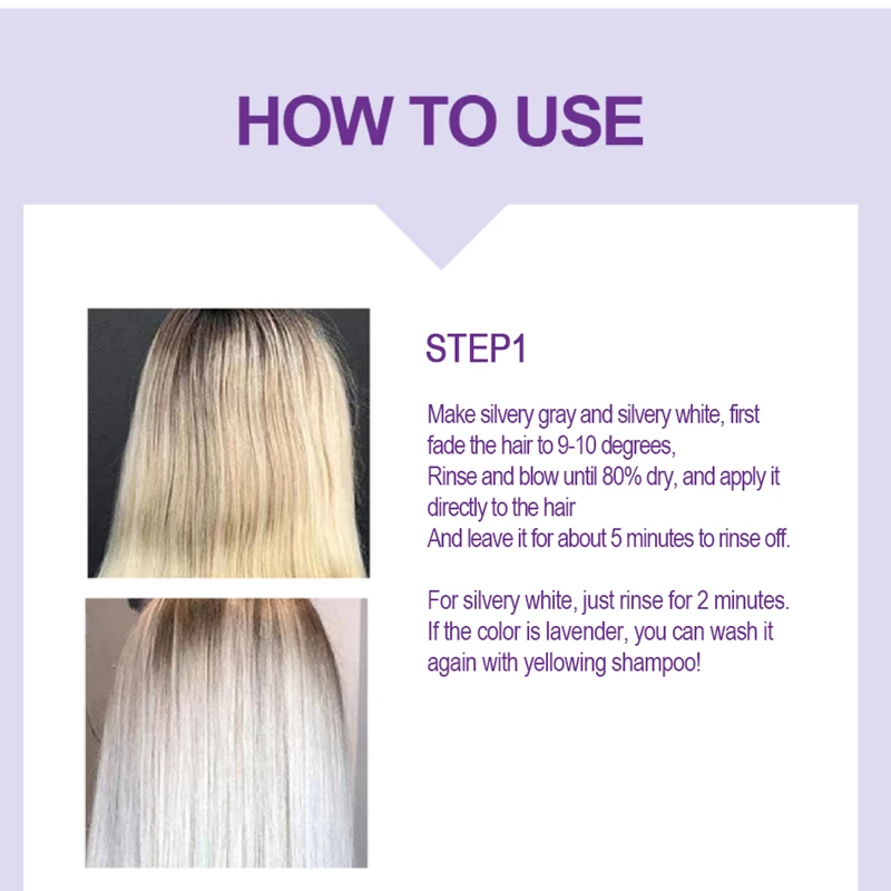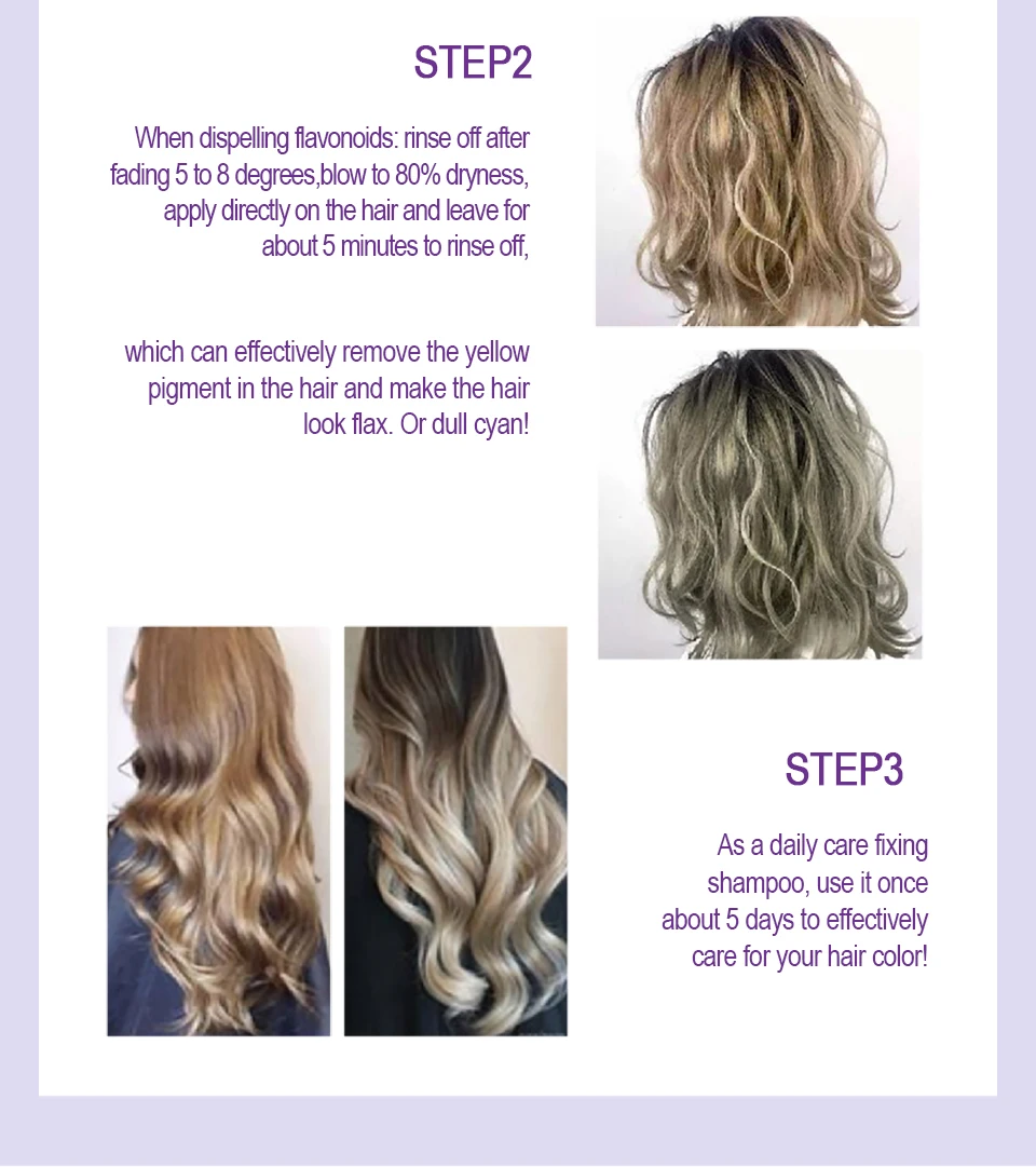 1. Сделайте серебристо-серый и серебристо-белый, сначала выцветите волосы до 9-10 градусов, промойте и продувите до 80% высыхания, нанесите его непосредственно на волосы и оставьте на 5 минут, чтобы смыть. Для серебристо-белого цвета просто промойте в течение 2 минут. Если цвет лавандовый, вы можете помыть его снова с желтым шампунем! 2. При рассеивании флавоноидов: смыть после выцветания 5-8 градусов, сдуть до 80% сухости, нанести непосредственно на волосы и оставить около 5 минут, чтобы смыть, который может эффективно удалить желтый пигмент в волосах и сделать волосы выглядят льняными. Или тусклой голубой! 3. Как Ежедневный Шампунь для фиксации, используйте его один раз в 5 дней для эффективного ухода за цветом волос!