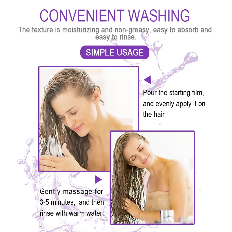 После мытья волос протрите его полотенцем, пока он не капнет, затем оторвите упаковочную пленку, вылейте стартовую пленку и равномерно нанесите ее на волосы, аккуратно помассируйте в течение 3-5 минут, подождите, пока волосы полностью впитаются, а затем смойте теплой водой.
