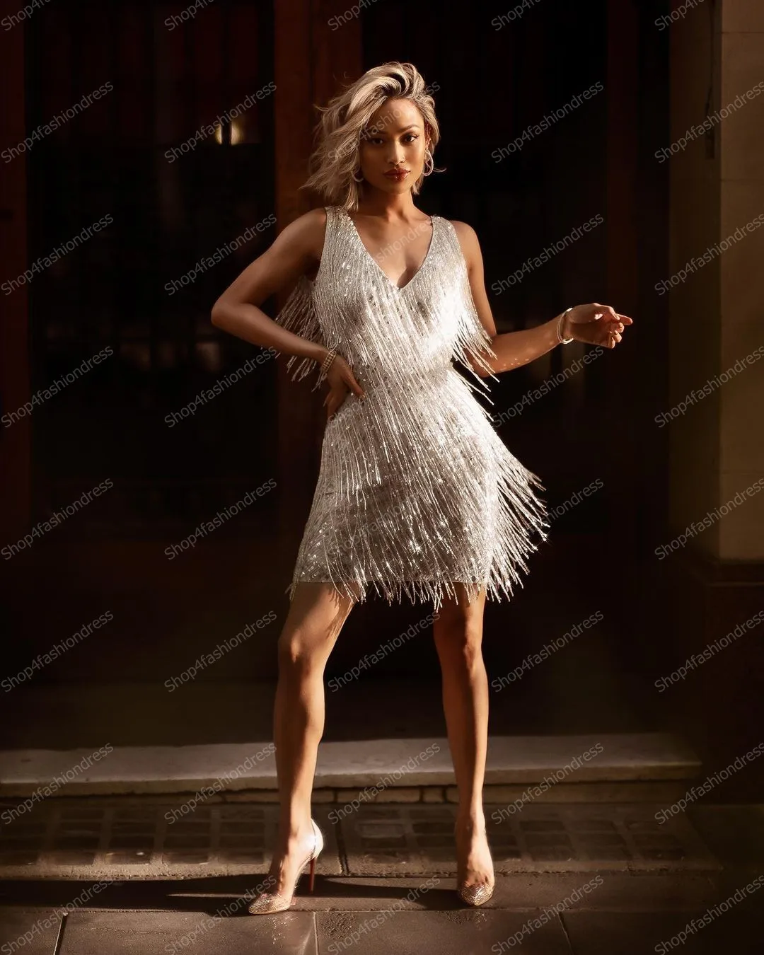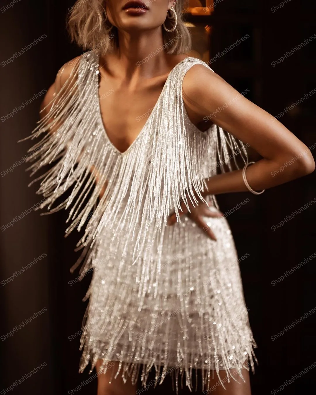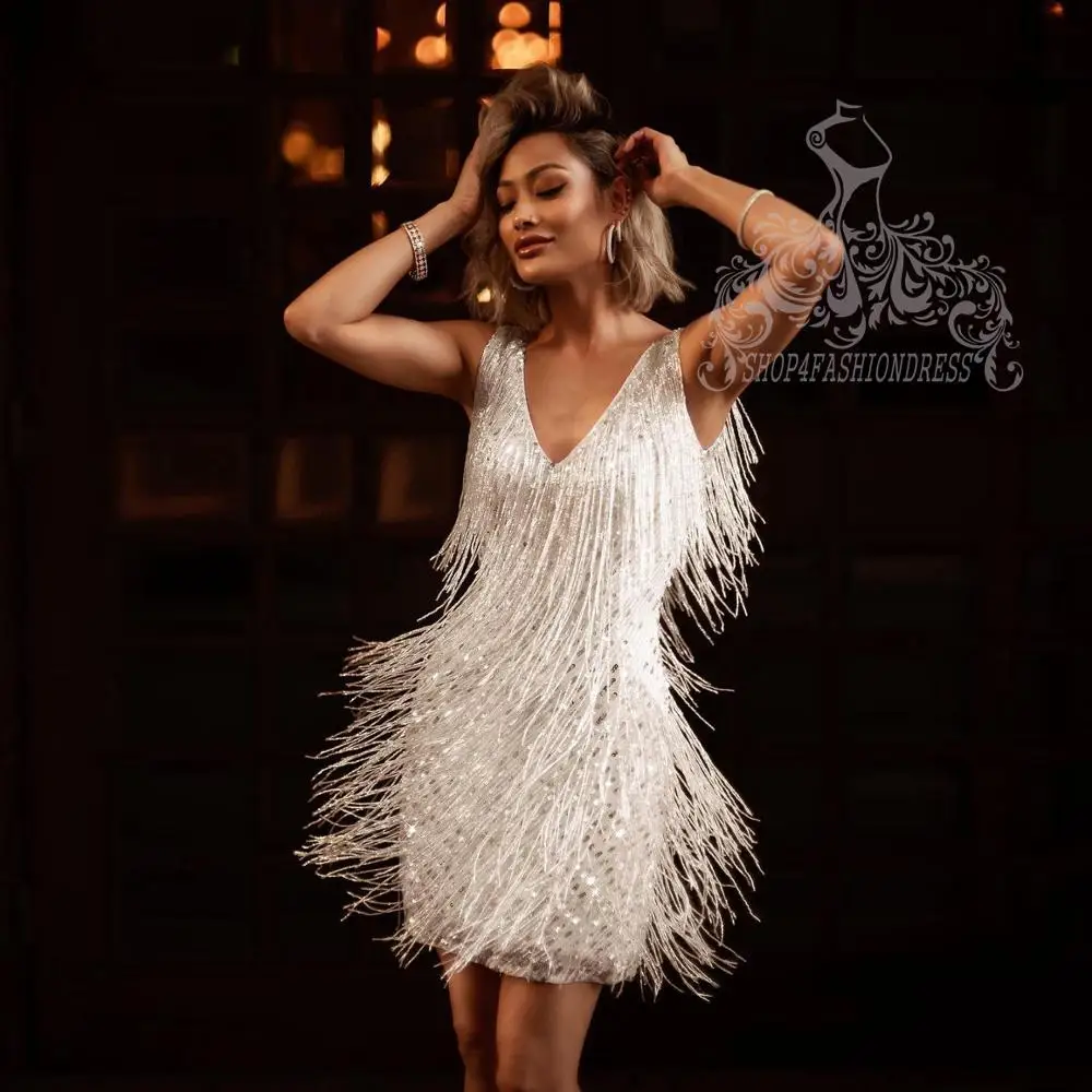 Блестящее белое платье с бахромой, очаровательное короткое вечернее платье знаменитости без рукавов с V-образным вырезом, индивидуальный пошив
