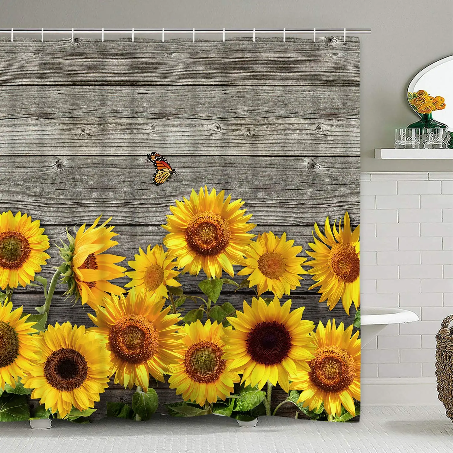 S-занавеска для душа с подсолнухом, деревянная занавеска для душа с подсолнухами и 12 крючками для ванной комнаты, водонепроницаемая прочная занавеска для душа