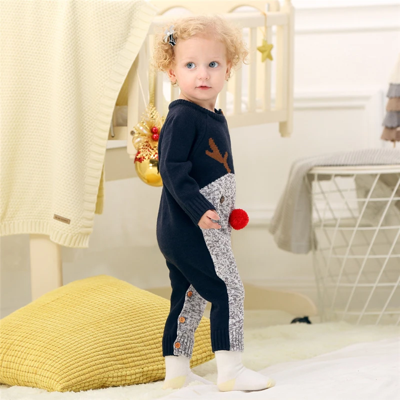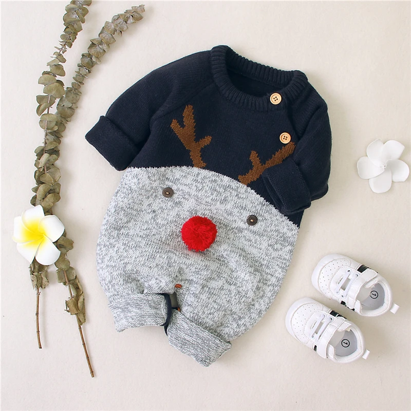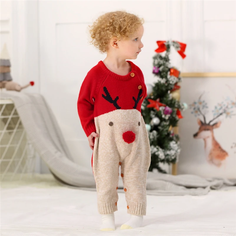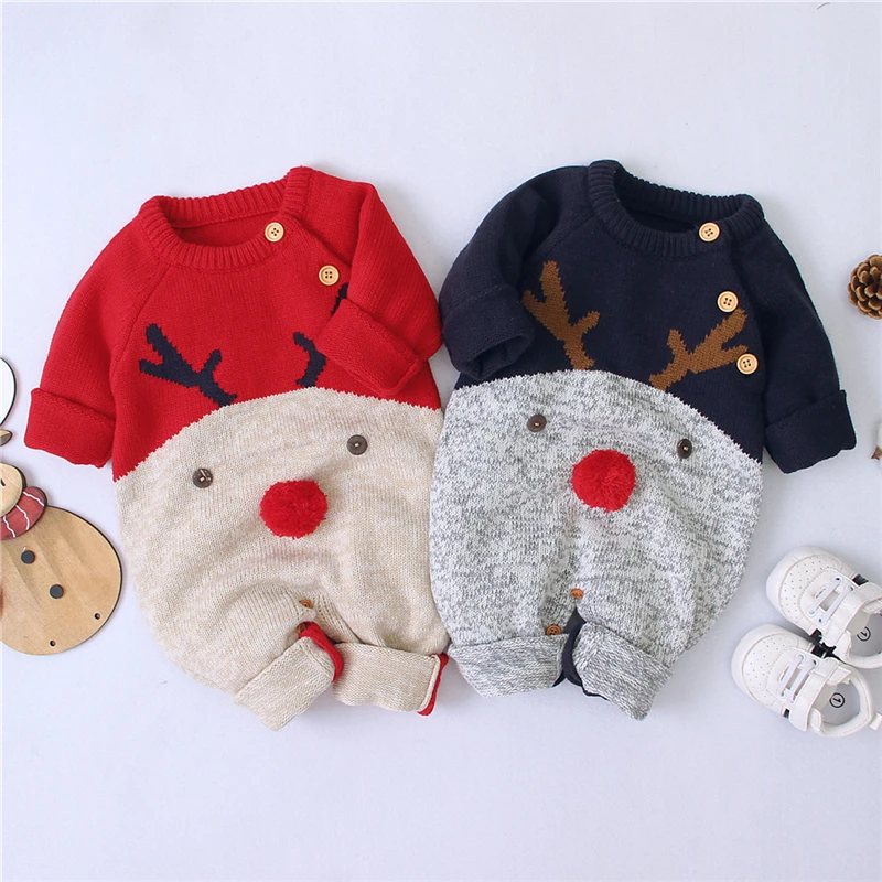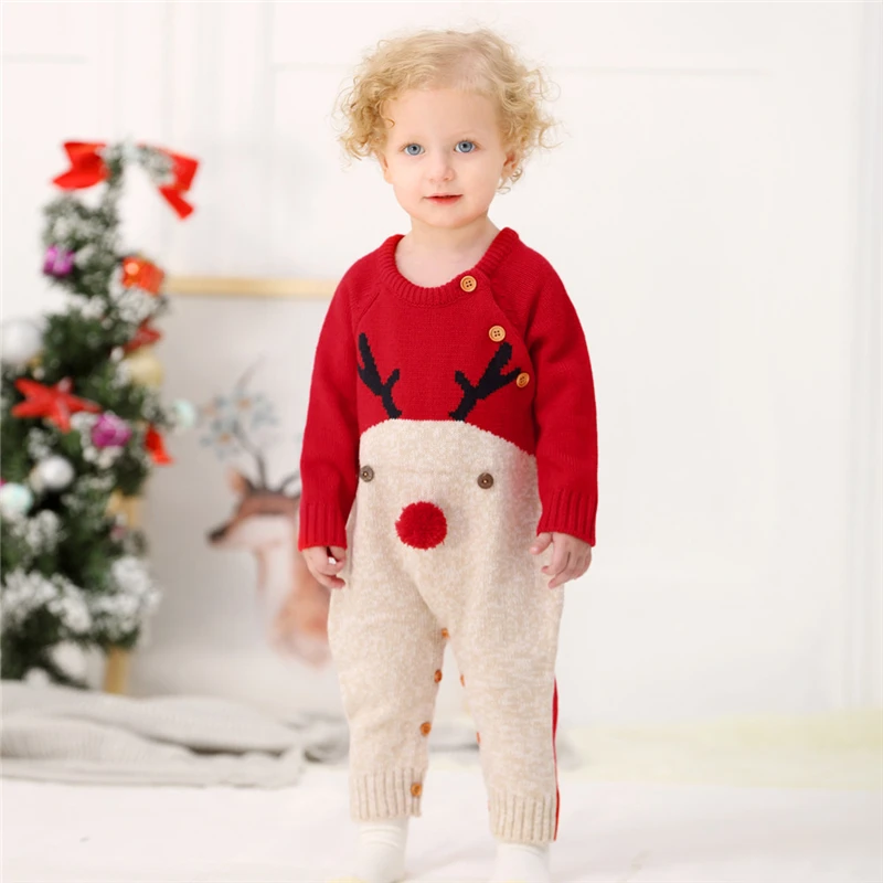 Рождественский Вязаный комбинезон для новорожденных девочек и мальчиков, комбинезон с оленем, теплые наряды, детские комбинезоны на возраст 0-18 месяцев
