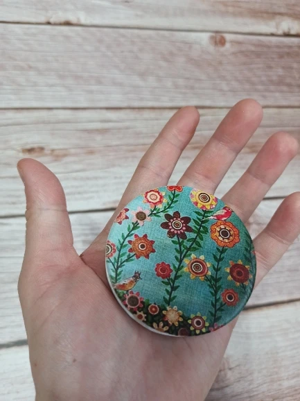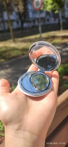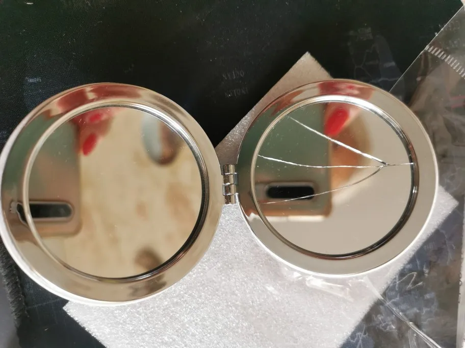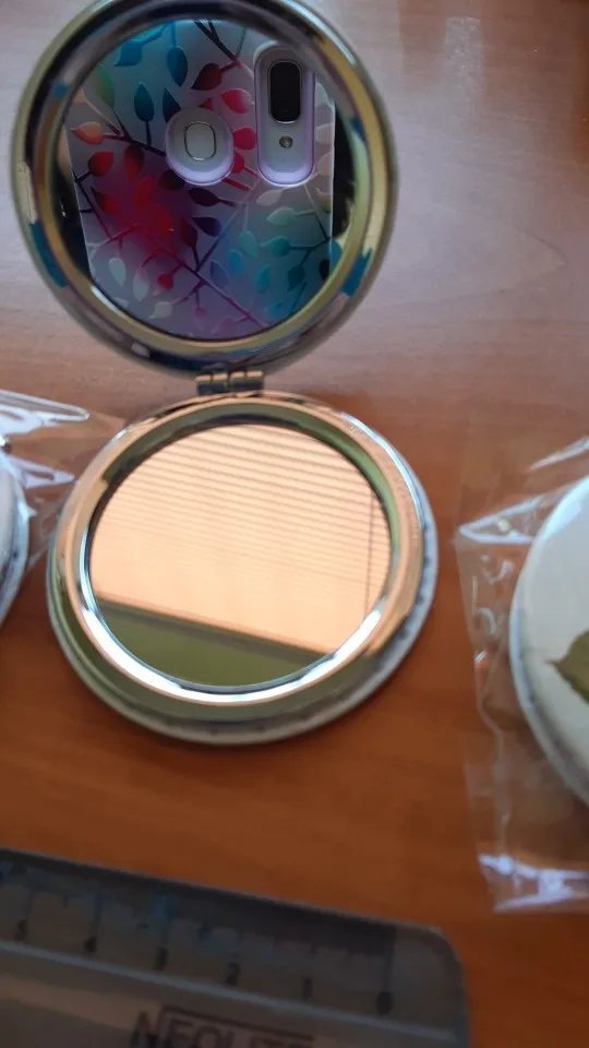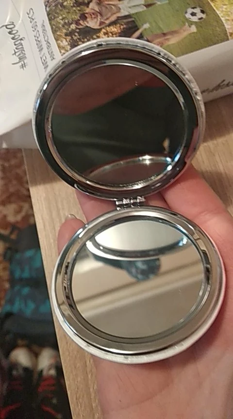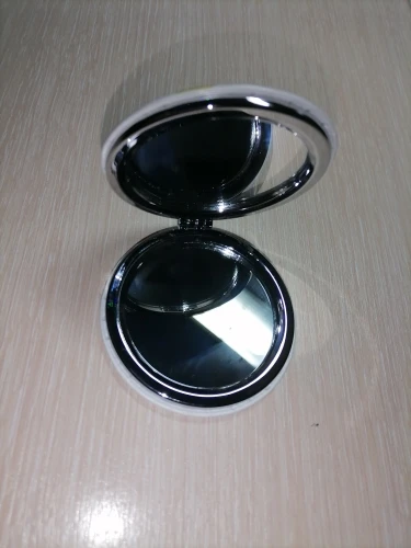 Особенность:Карманное зеркалоВнешний размер: 65 мм (Диаметр) * 10 мм (TХикнесс) прибл.Двухстороннее зеркало:Одна сторона-плоское зеркало, другая сторона-2x увеличительное зеркало.Использование: для макияжа, для красоты, подарок другу, для свадебных подарков.Фотографии товаров: