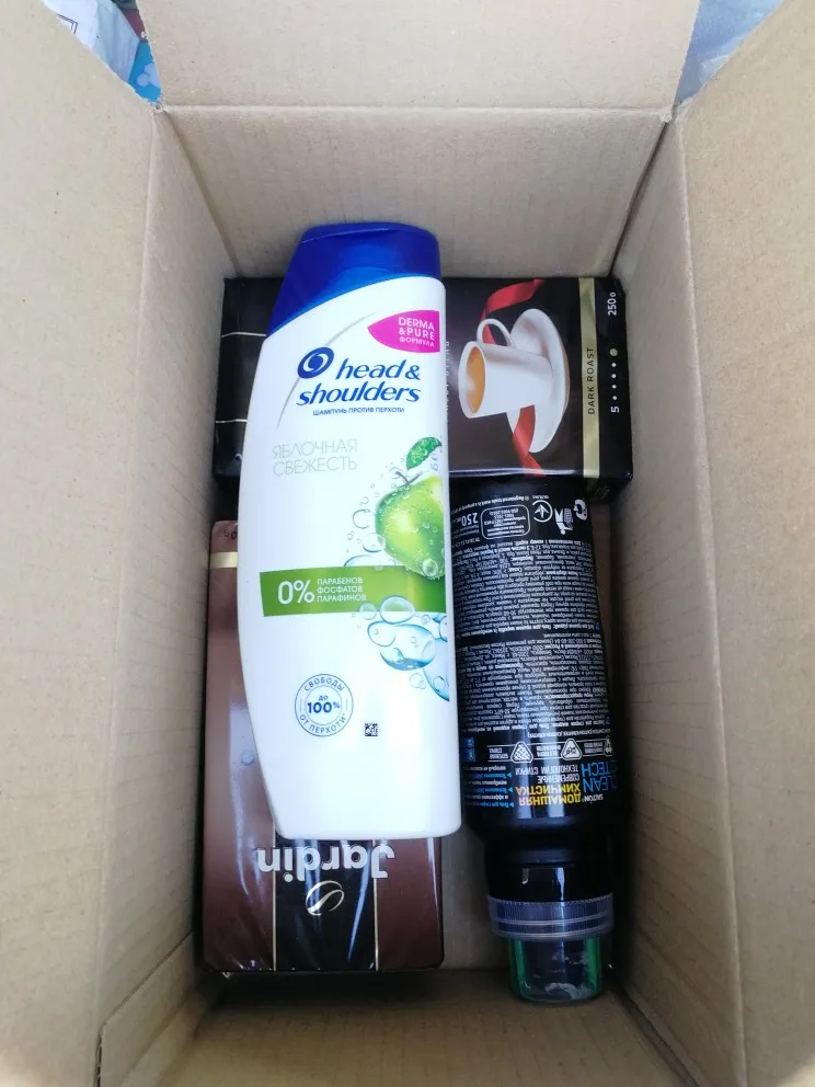 Здравствуйте. Доставка в г. Магадан в пункт pickpoint 9 дней. Упаковка картонная коробка. Сроки годности товаров хорошие. Ничего не пролилось, но продукты и химия в одной коробке, ни каких плёнок или пакетов, в случае пролитии шампуня все кофе на выкид, за это минус звезда.